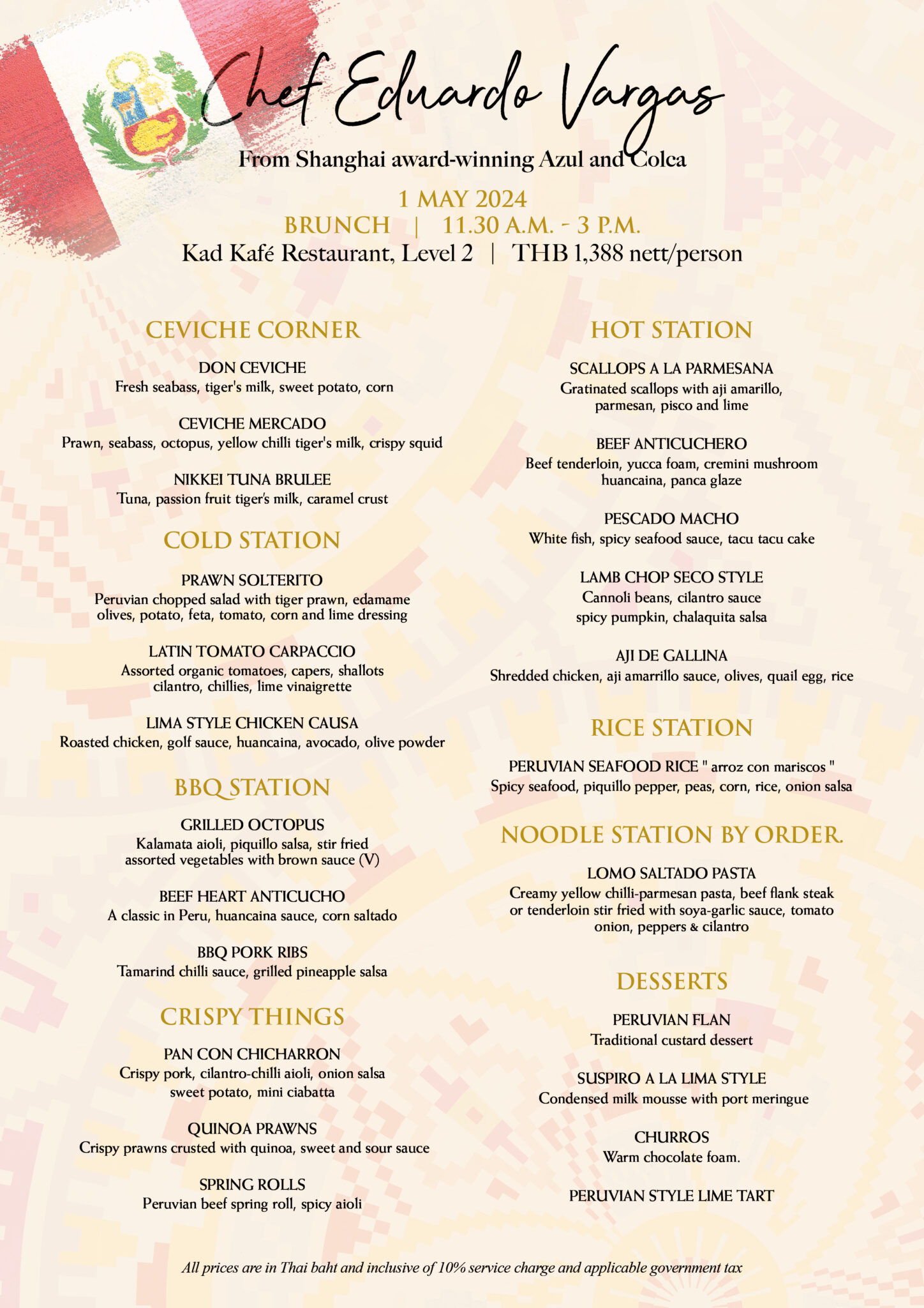 Now, if you don’t feel like a formal sit down, then make sure you book the 1st May brunch for only 1,388 baht per person which will offer up several opportunities to explore the Nikkei cuisine. There will be a ceviche corner where a smorgasbord of ceviches will be served, with cool sounding names like the Don Ceviche which promises fresh seabass in tiger’s milk served with sweet potato and corn. An intriguing sounding Nikkei tuna brûlée and many other cold dishes from vegetarian to poultry and seafood. The BBQ station will feature grilled octopus in kalamata aioli and piquillo salsa served with stir fried vegetables (yes, the stir fry Asian tradition is a strong part of the Nikkei cuisine).