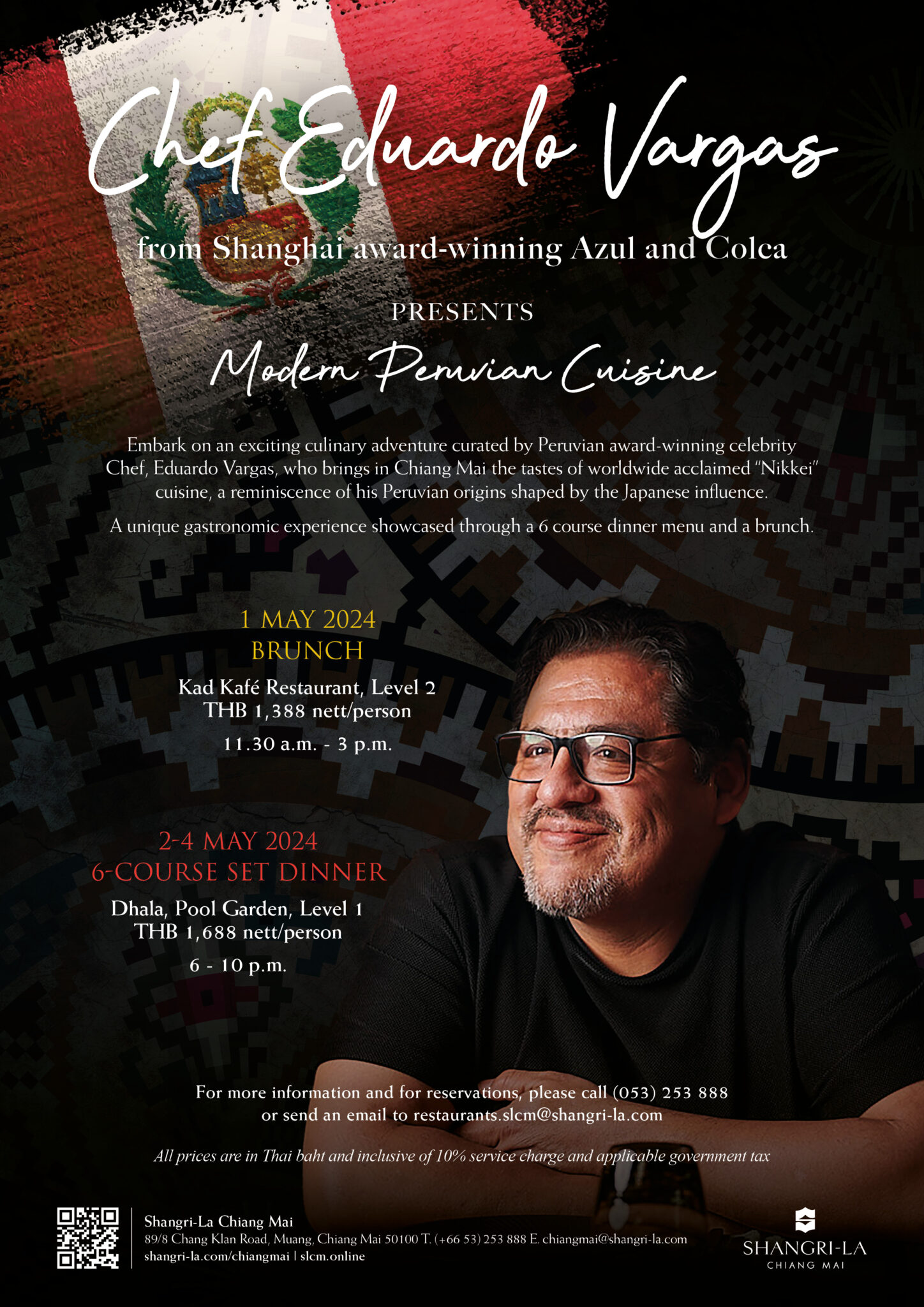 Shangri-La Chiang Mai will be hosting Peruvian celebrity Chef Eduardo Vargas next month, as he presents a first for Chiang Mai’s food lovers – Nikkei cuisine.