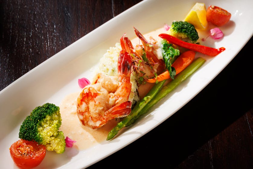 There are two main dishes from which to choose: the beef tenderloin with roasted vegetables, sweet potato gnocchi, deep fried shiitake and champignon mushroom spring roll with red wine jus and the Thai white prawns with lemon butter sauce served with creamy risotto.