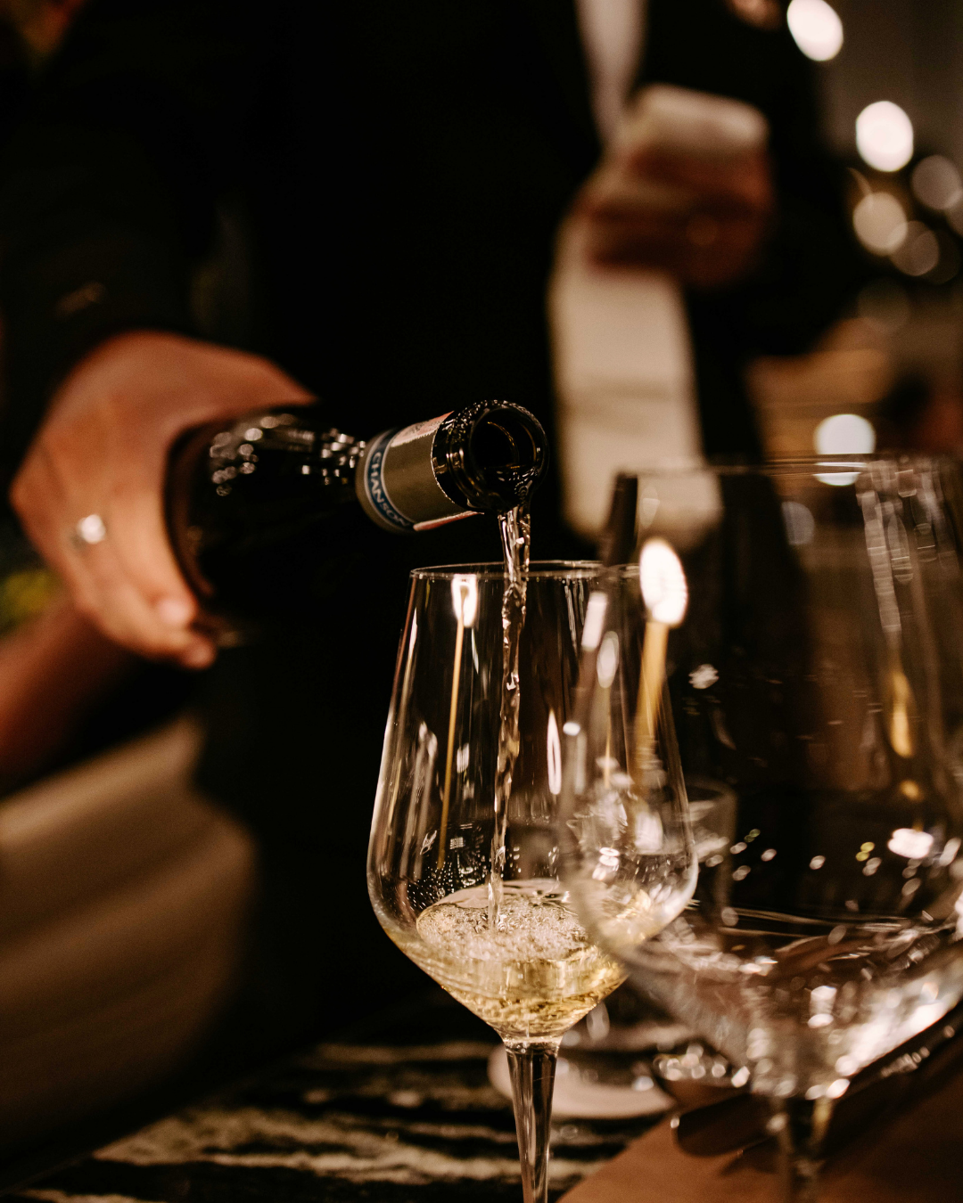 The evening opens with Hua Hin Oscietra caviar paired with namprik, betel leaf, and crispy pork crackling — a bold, textured opening that sets the tone early. From there, a chilled Chiang Mai heirloom tomato gazpacho with seared scallop and ikura leads into grilled blue river prawn ravioli in shellfish emulsion with makrut lime. The fish course brings charred snow fish wrapped in banana leaf with turmeric and lemongrass, followed by red curry glazed short rib with local smoked bone marrow. Dessert is Chiang Mai strawberry with smoked ice cream, black peppercorn, and burrata.