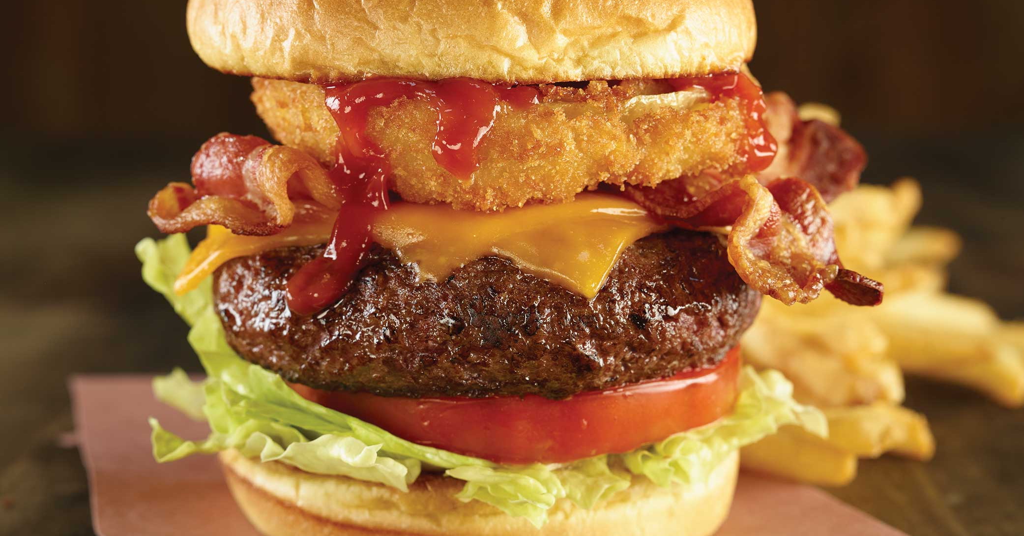 This burger is a signature of the Hard Rock Cafe, rich, meaty and perfectly balanced. The beef is premium grade and you can really taste the meat in every bite. The beef is packed in a bun alongside smoked bacon, cheddar cheese, onion rings, tomatoes and salad, and served with a side of French fries and a pot of the unique hard rock dipping sauce.