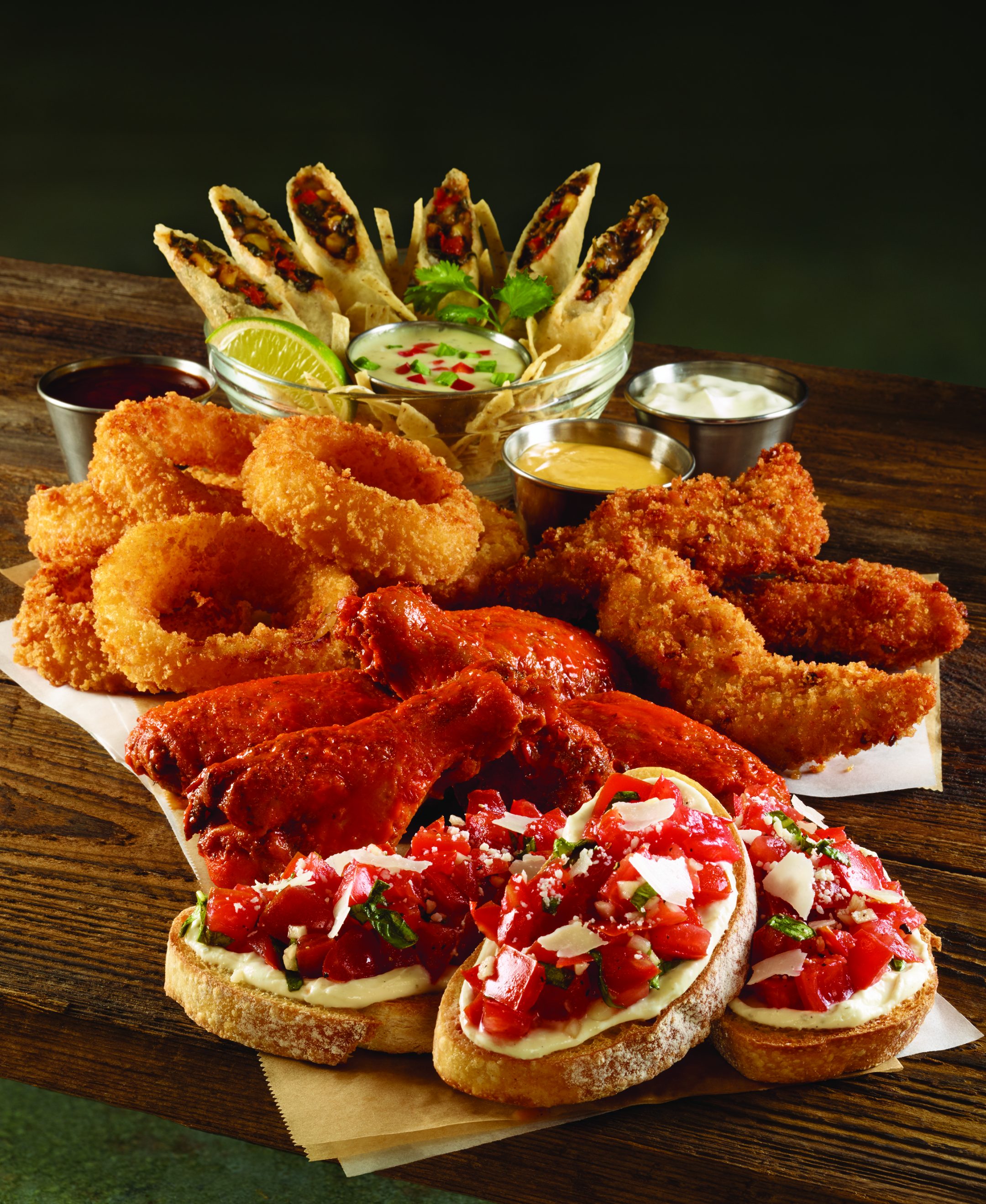 A huge platter of popular appetisers including signature wings, onion rings, tuelo chicken tenders, santa fe spring rolls and bruschetta served with honey mustard, hickory barbecue and blue cheese dressing.