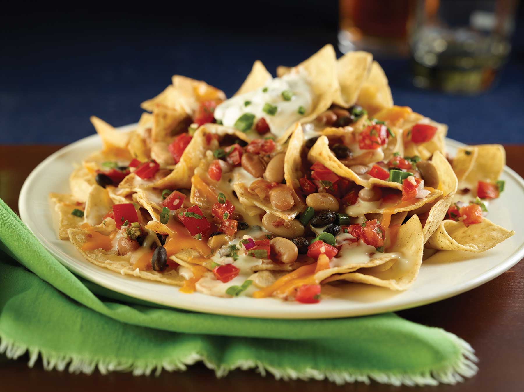Tortilla chips piled high and layered with three bean mix, mixed cheese, pico de gallo, jalapenos and green onions. Garnished with sour cream and with an option to add grilled chicken, fajita beef or guacamole.