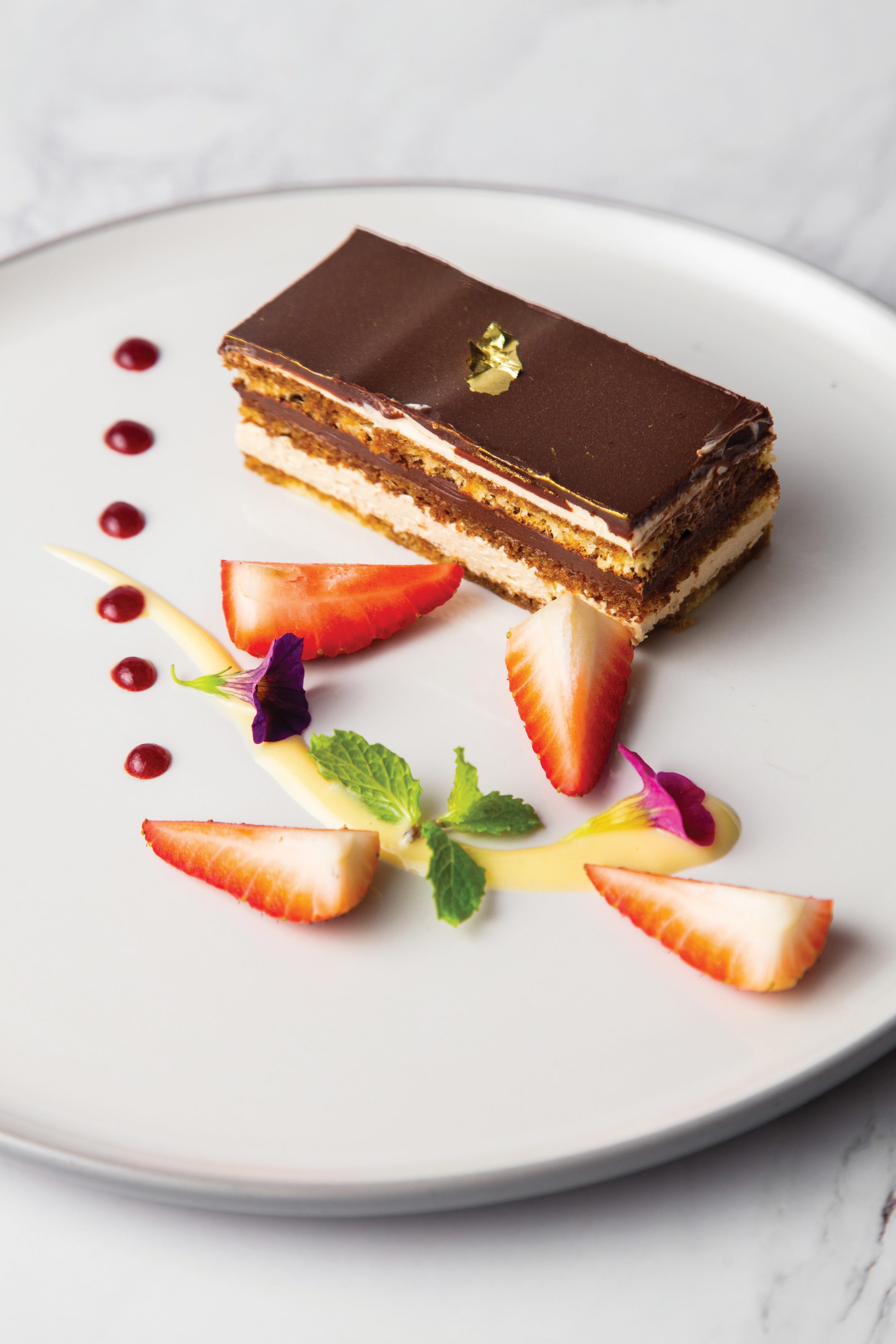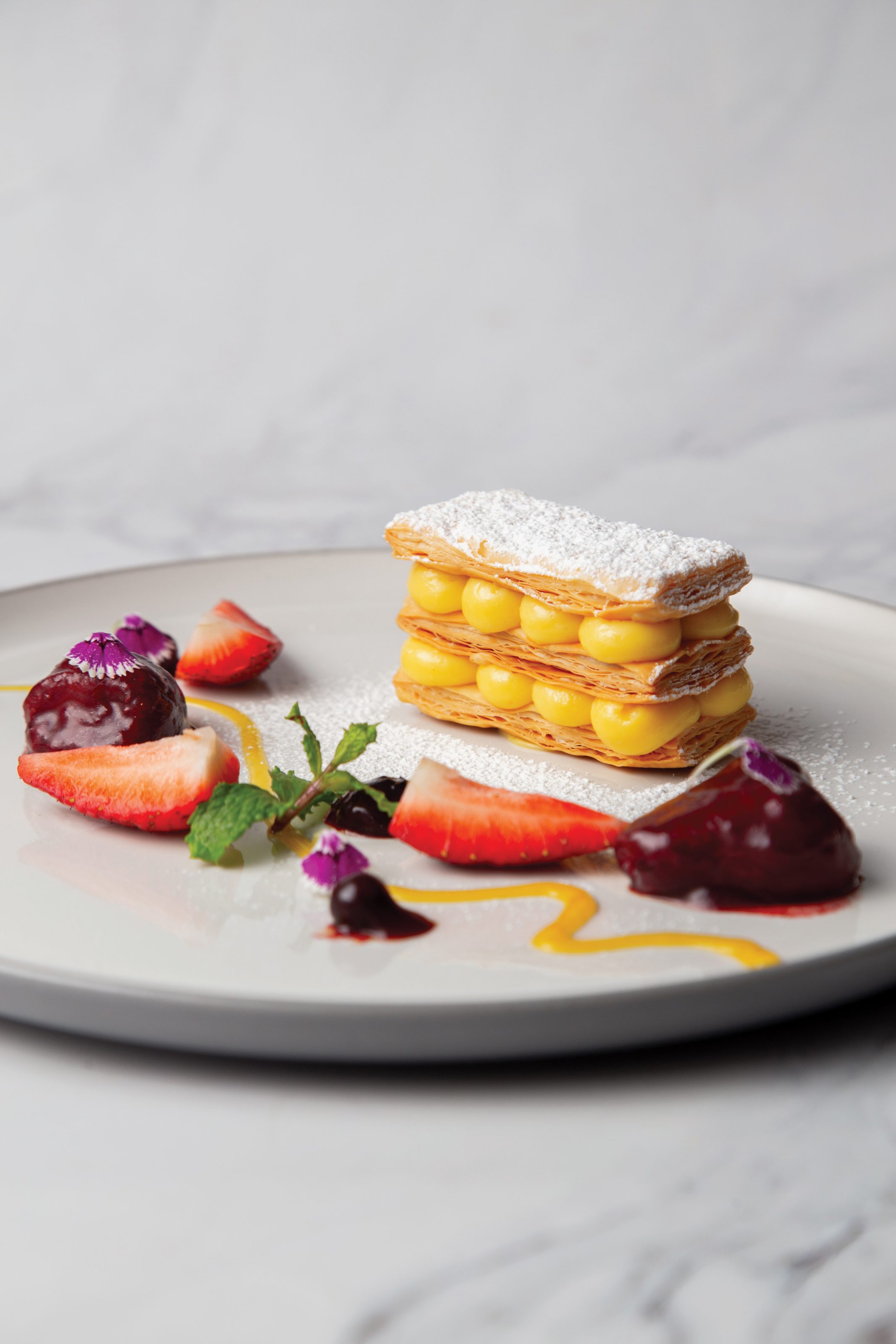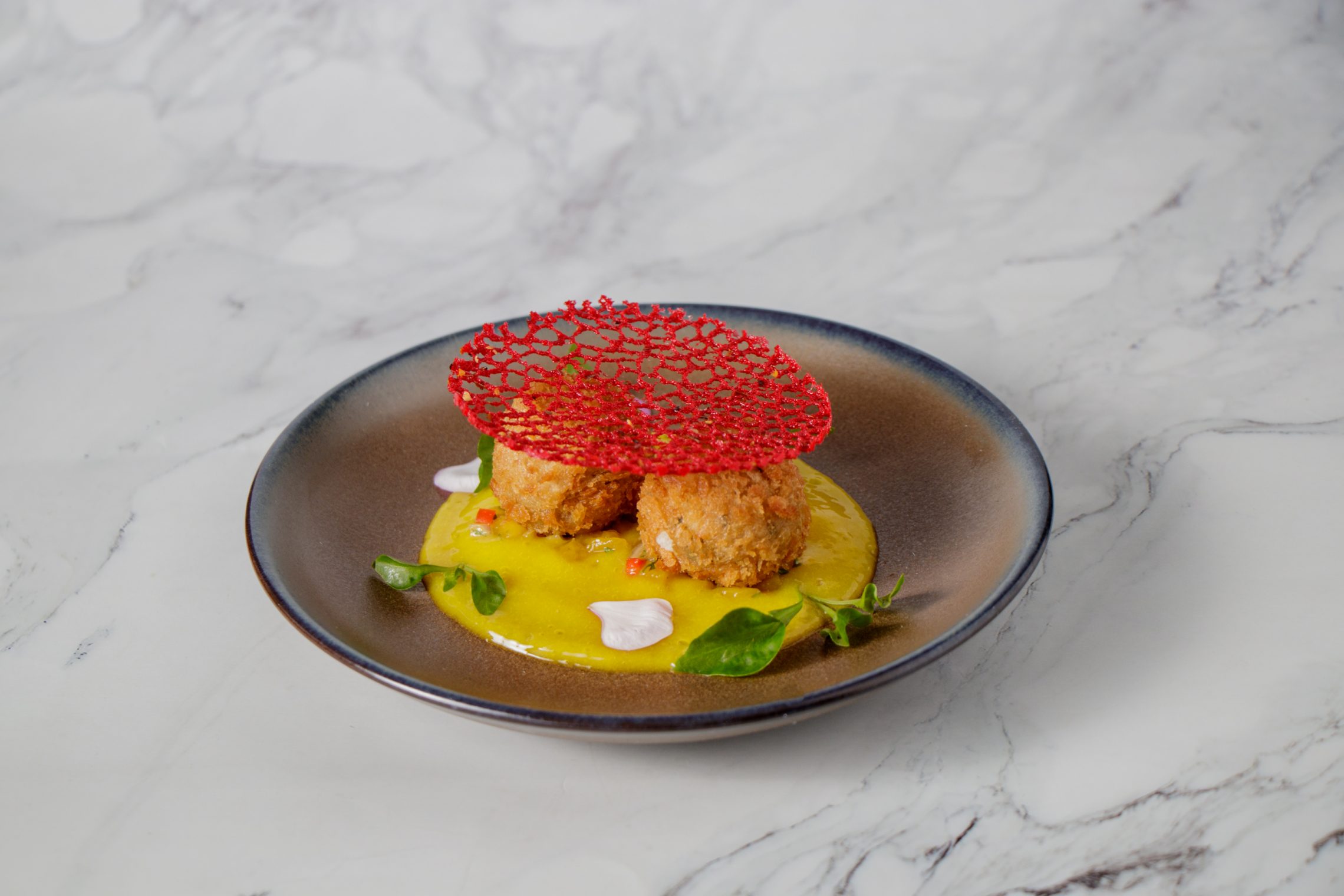 Fermented pork, crispy rice and red curry balls are topped with a dainty and vibrant red tuile of Szechuan peppers. A light mango puree gives this dish, inspired by Laos, Thai, Burmese and Chinese cultures, a refreshing twist.
