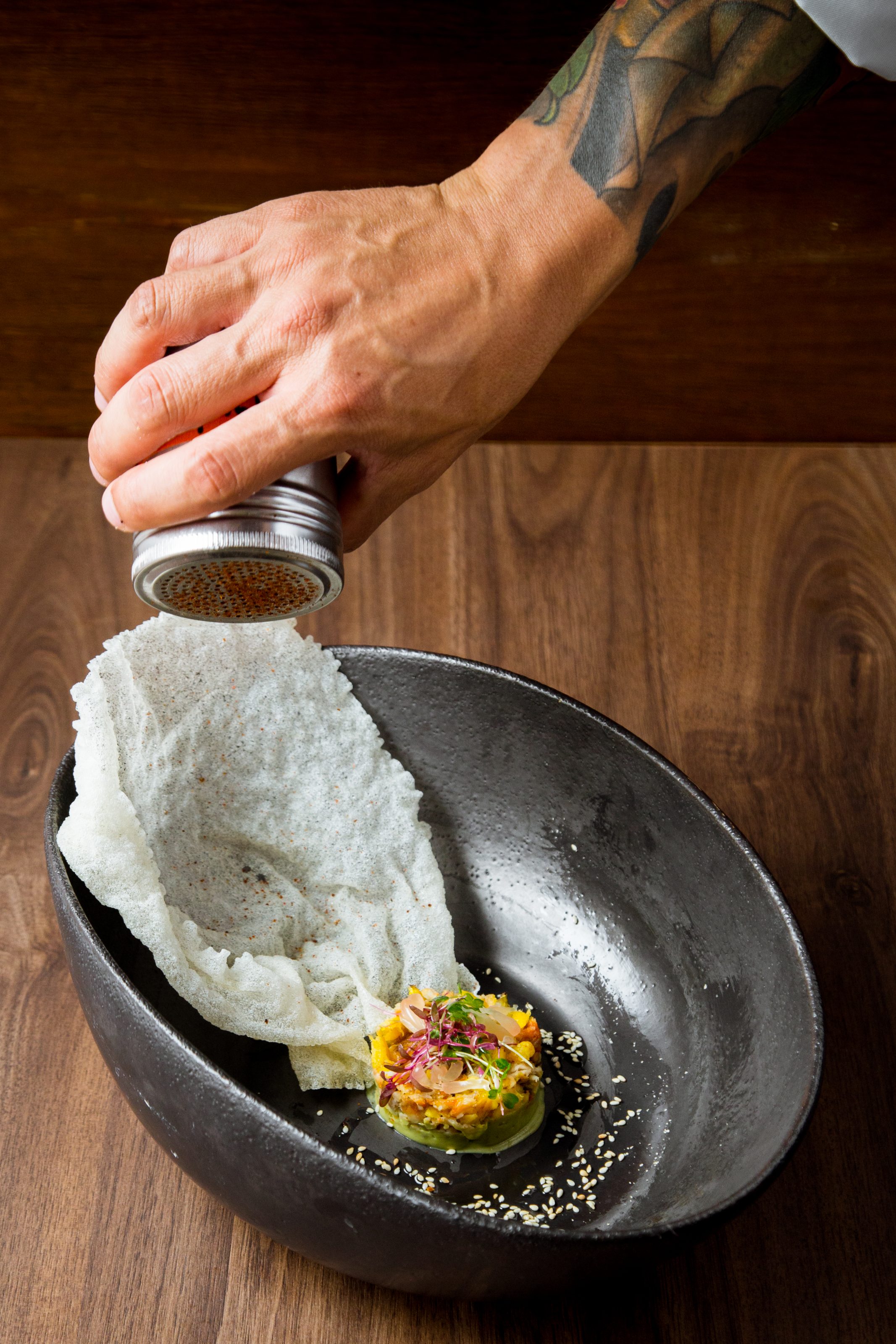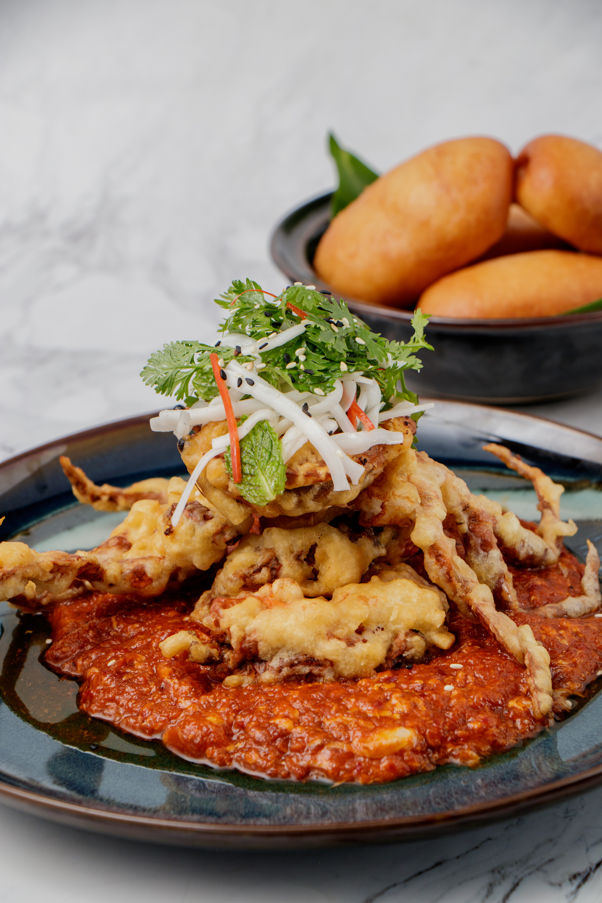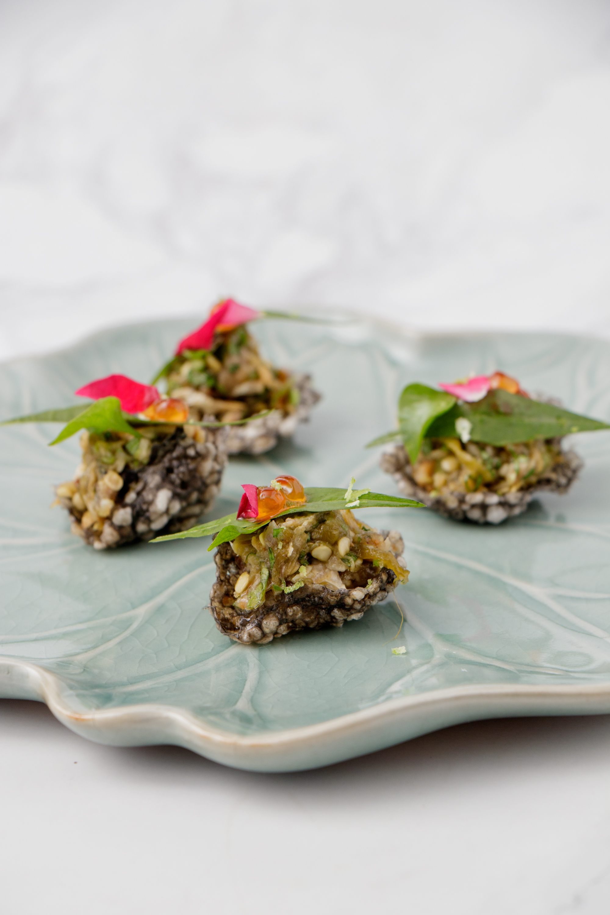 Chopped catfish is mixed with eggplant chili paste and served with crispy fried tapioca balls served with squid ink. The dish evokes flavours and aromas of a classic Isaan larb, but intriguingly without any traditional larb ingredients.