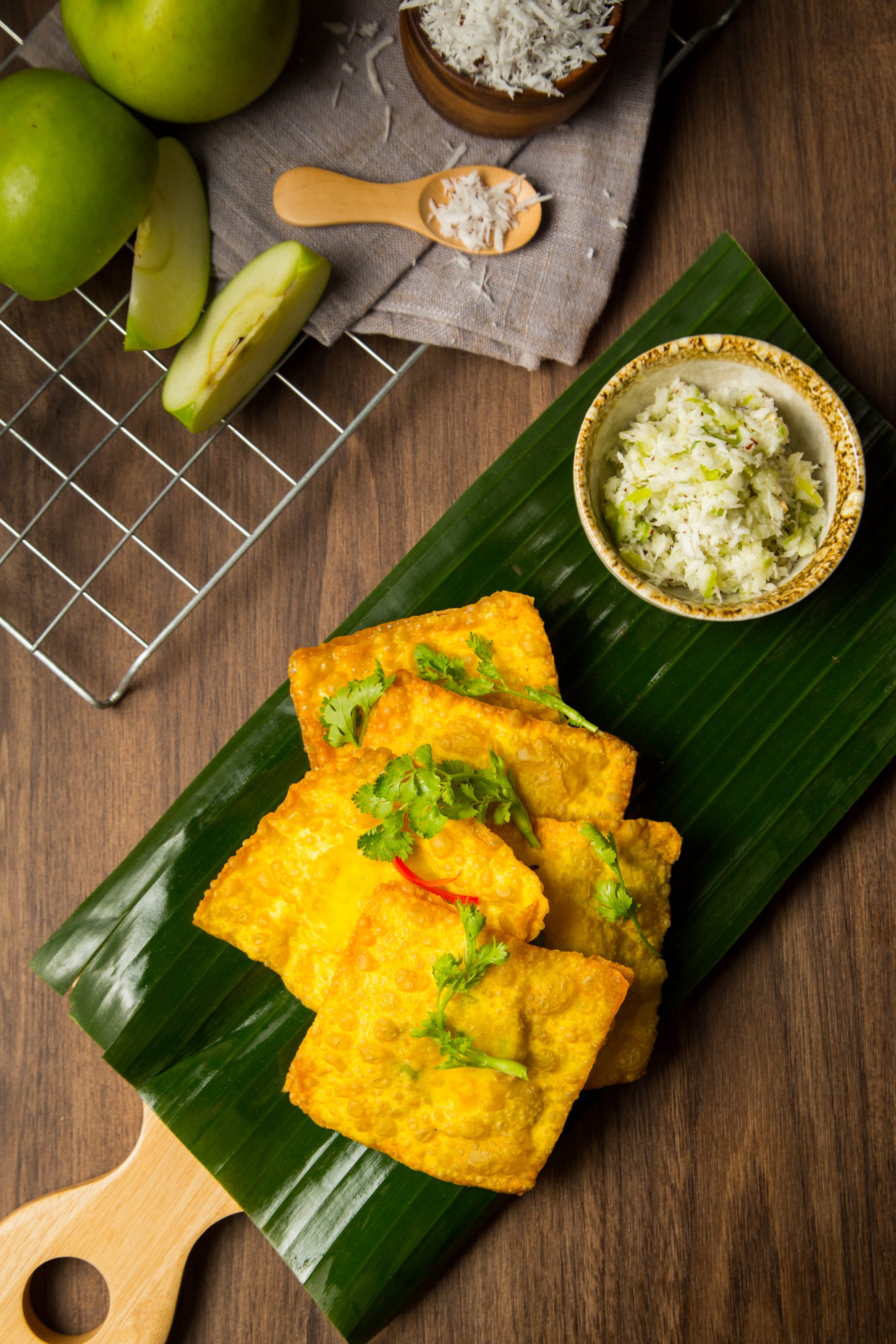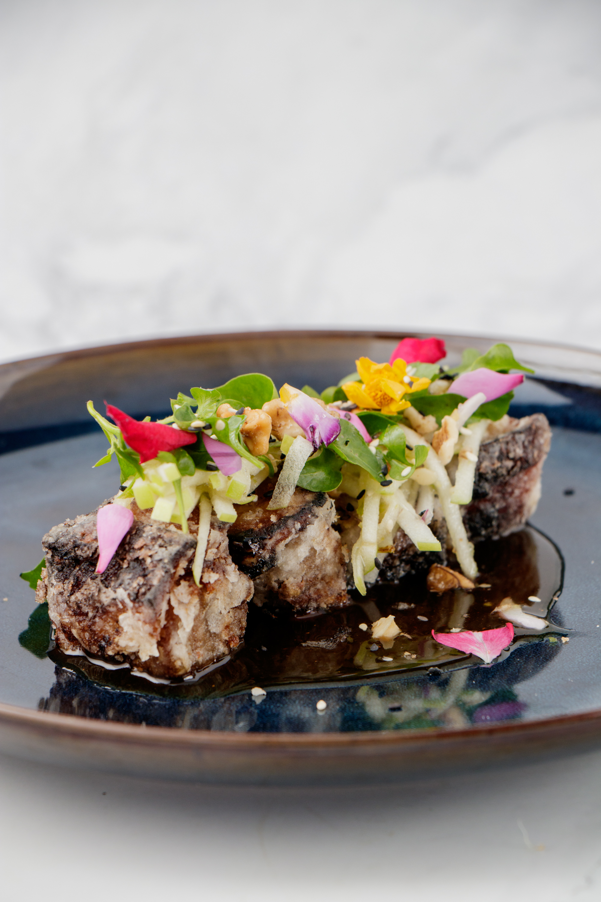 Tender and juicy pork hock is cut into cubes then batter-fried with cassava flour, making for a crunchy and moist bite which simply melts in the mouth. The sweet yuzu and green apple sauce adds tart and freshness.