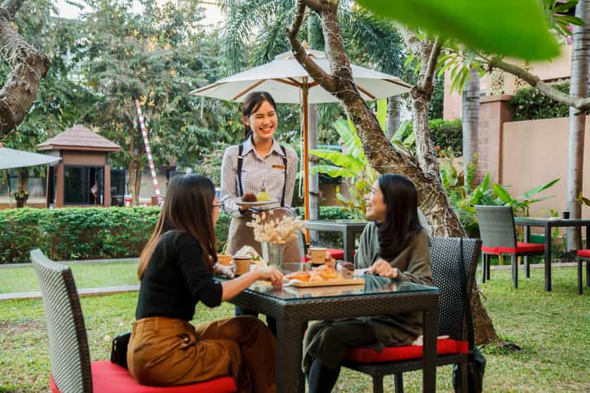 Sip some herbal tea, savour a hot cup of coffee or taste some freshly baked pastries while you wait for your bouquet of flowers to be assembled. The coffee starts at a very reasonable 50 baht per cup and the pastries at only 40 baht per piece. Take a bite from a large croissant, a muffin, a chocolate cookie, or grab a baguette to take home. They also have mango sticky rice and tiramisu, both of which are delicious and if you want to try something fancy, then definitely check out the caramel exotic with its combination of passion fruit, coconut and pineapple or the refreshing green tea cake, The Mountain. Great prices, great baked goods, convenient and a perfect quick stop.