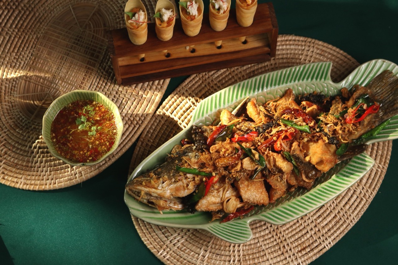 The classic massaman curry retains its traditional flavours but instead of beef, boats a crispy-skinned and tender-meated duck confit as its main protein. A simple mackerel, deboned, marinated and mushed in fresh herbs and spices, is re-stuffed into the fish, and served wafting with aromas. The classic Chiang Mai Northern sausage, sai-ua, is served with a concoction of Southern spices, making for a punchy dish overflowing with flavour. Then there is the classic mango sticky rice which is wrapped like a spring roll and served with ice cream.