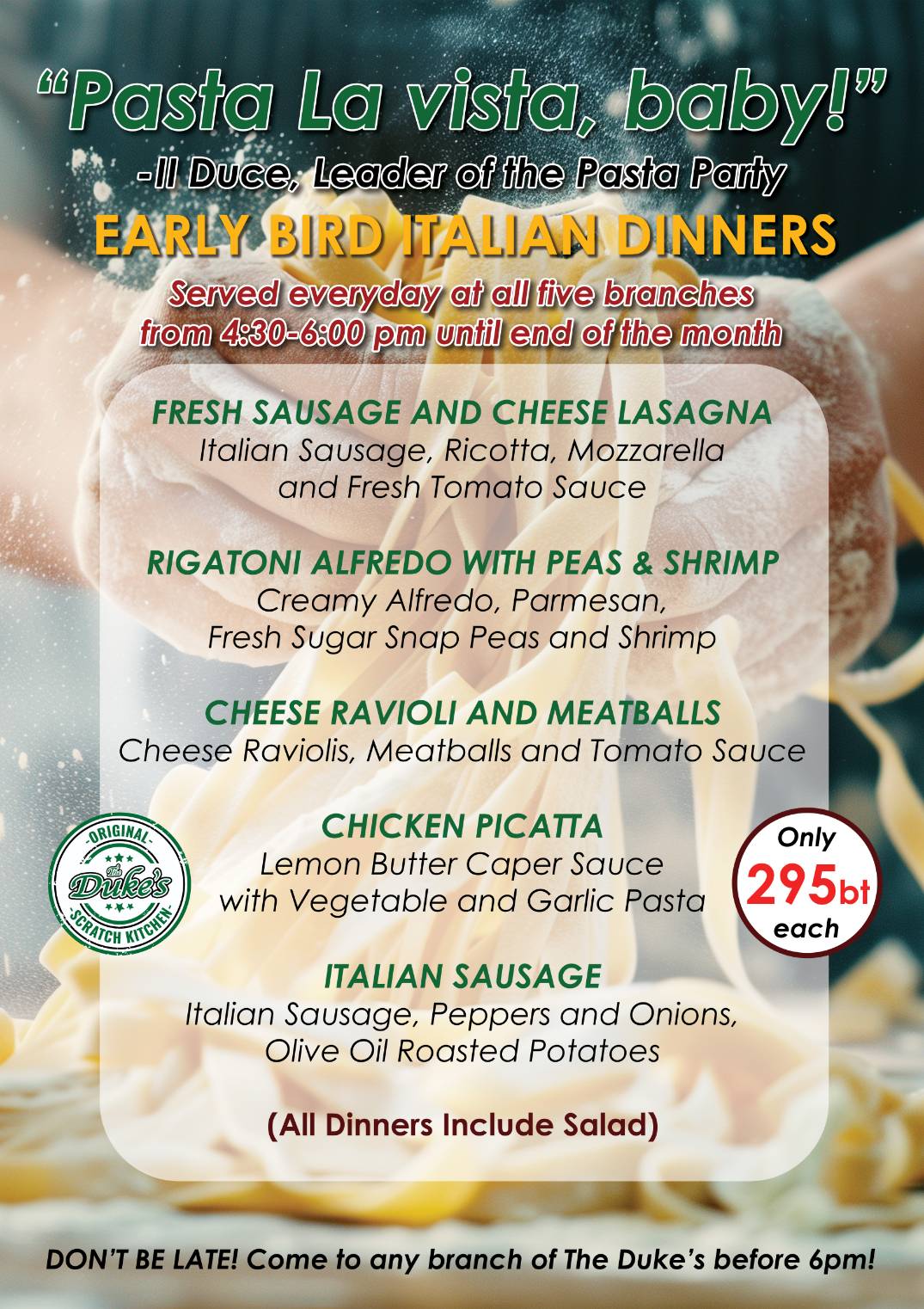If you want to really get the most out of your visit then head into any branch between 4.30pm and 6pm for the early bird ‘Pasta la vista, baby!’ promo. For only 295 baht, you can order any of these five pastas and enjoy a free garden salad: fresh Italian sausage, mozzarella and ricotta lasagna in fresh tomato sauce; creamy rigatoni Alfredo with fresh sugar snap peas and shrimp; cheese ravioli and meatballs in tomato sauce; chicken piccata with lemon butter caper sauce, vegetables and garlic pasta; and Italian sausages with peppers, onions and olive oil roasted potatoes.