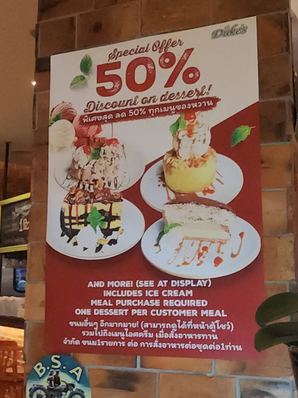 There is currently a pretty tempting promotion on offer, which will be irresistible for those of us who enjoy a sweet delight now and then. For every meal ordered at The Duke’s, you can receive one dessert per person, at 50% of its price. Simply head to the terribly tempting display in the middle of The Duke’s to see cakes, cookies, and other sweet desserts; from the all-American apple pie to a spicier cinnamon roll. Take your pick and add it as the perfect ending to your meal for a pretty chunky 50% discount.