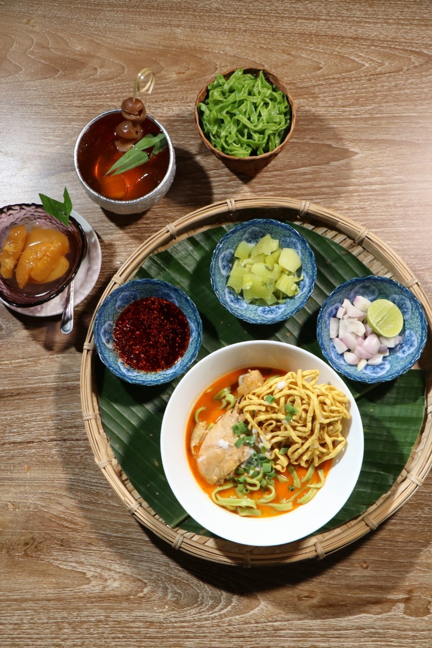 The rice vermicelli with Northern Thai curry sauce and pork (nam ngiew) or the Northern noodle creamy soup with chicken/Angus beef (khao soy) are both must-try northern delicacies, especially with the khao soy dish coming with a special Comedara twist: served with Chiang Da leaf flour noodles, an award-winning creation using native leaves, which is a must try. And another menu highlight recommended is the Thai peach in syrup for desserts, washed down by a long a juice soda.