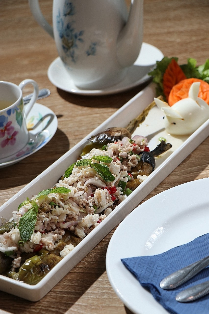 The famous Kad Luang fried pork on the bone served with nam-prik-dang chili dip and wild plum is a perfect nibble to accompany any drink or meal, as is the spicy grilled eggplant salad with crab meat and minced pork, all marinated and topped with a herb-infused spicy sauce.