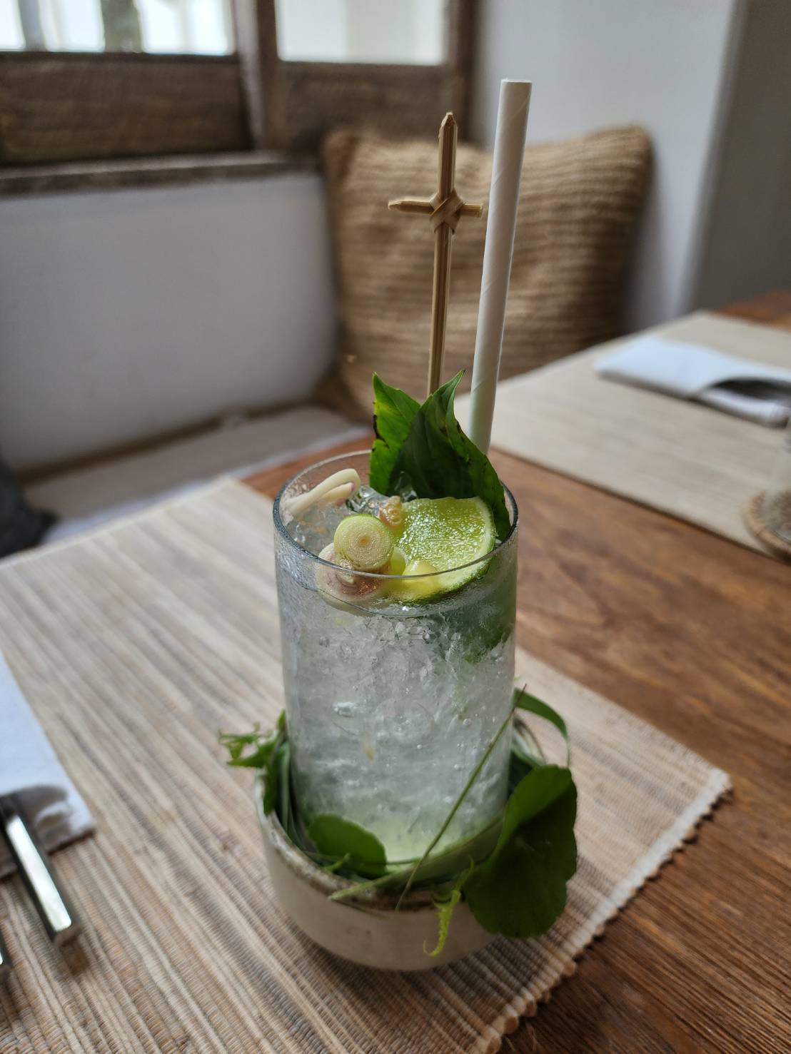 With so much going on from this dish, the pairing cocktail is kept simple. Lanna vodka is mixed with Prosecco Brut and homemade kaffir lime syrup topped with some jaunty and fresh Vietnamese leaves and mint leaves.