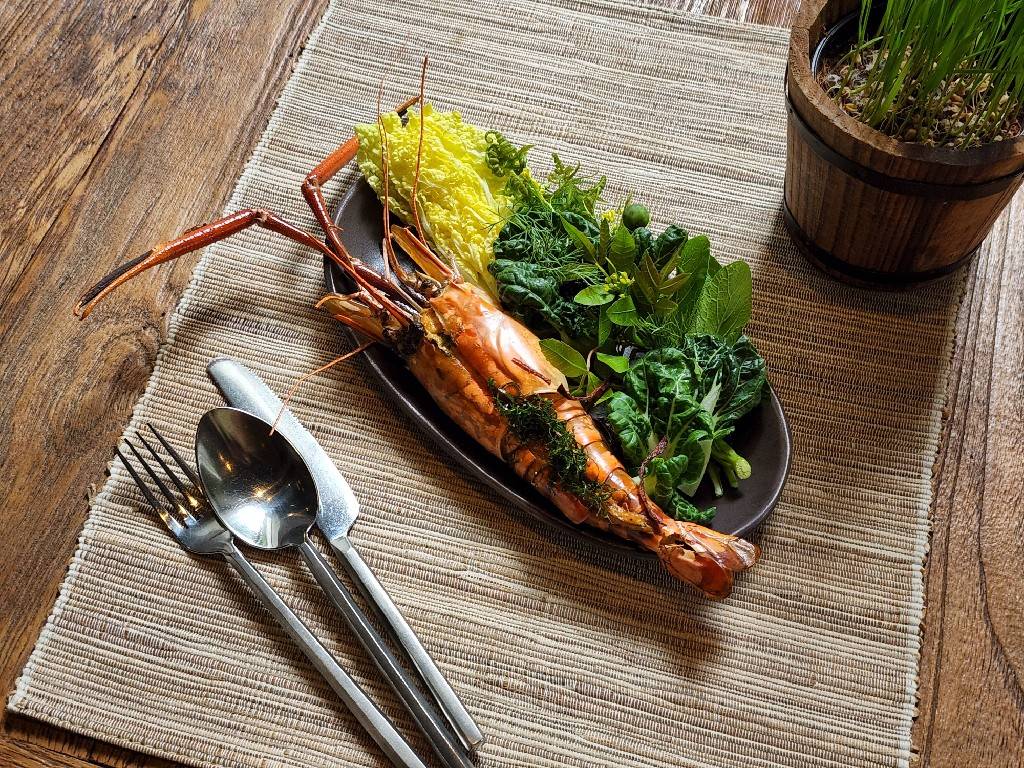 Grilled river prawns with fresh meat scooped out and cooked with Lanna spices and served Lanna style has the nose twitching with scents of lemongrass, turmeric and fresh spicy herbs. Fresh salad is served to cool the palate.