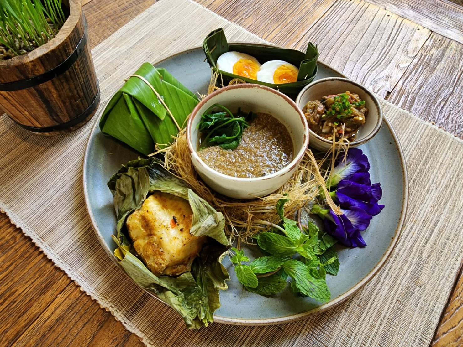 Inspired by the blooming season, classic Northern mob pu is a rich crab broth which wafts sweet aromas. Served with roasted rice and seasonal vegetables, there is also a slice of marinated grilled Siam red tail catfish in chilli paste and a spicy eggplant dip to round off this rather wonderful course.
