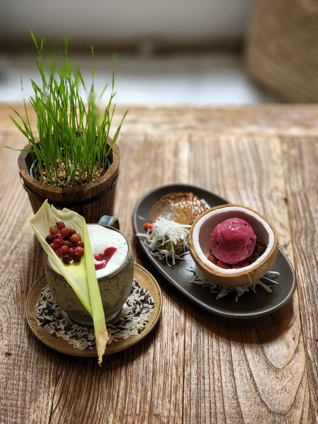 There is now plenty of rice so rice is the hero of this dish. Mixed pounded unripe rice with soy bean filling is served with Thai blueberry and coconut ice cream.