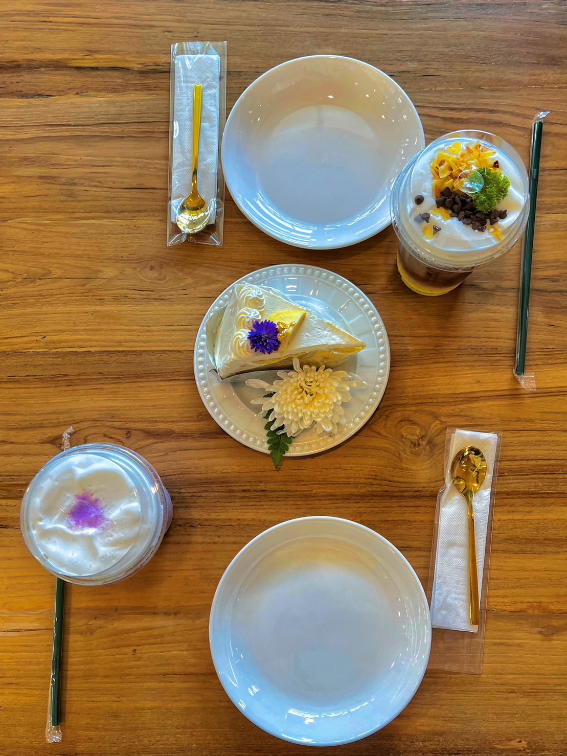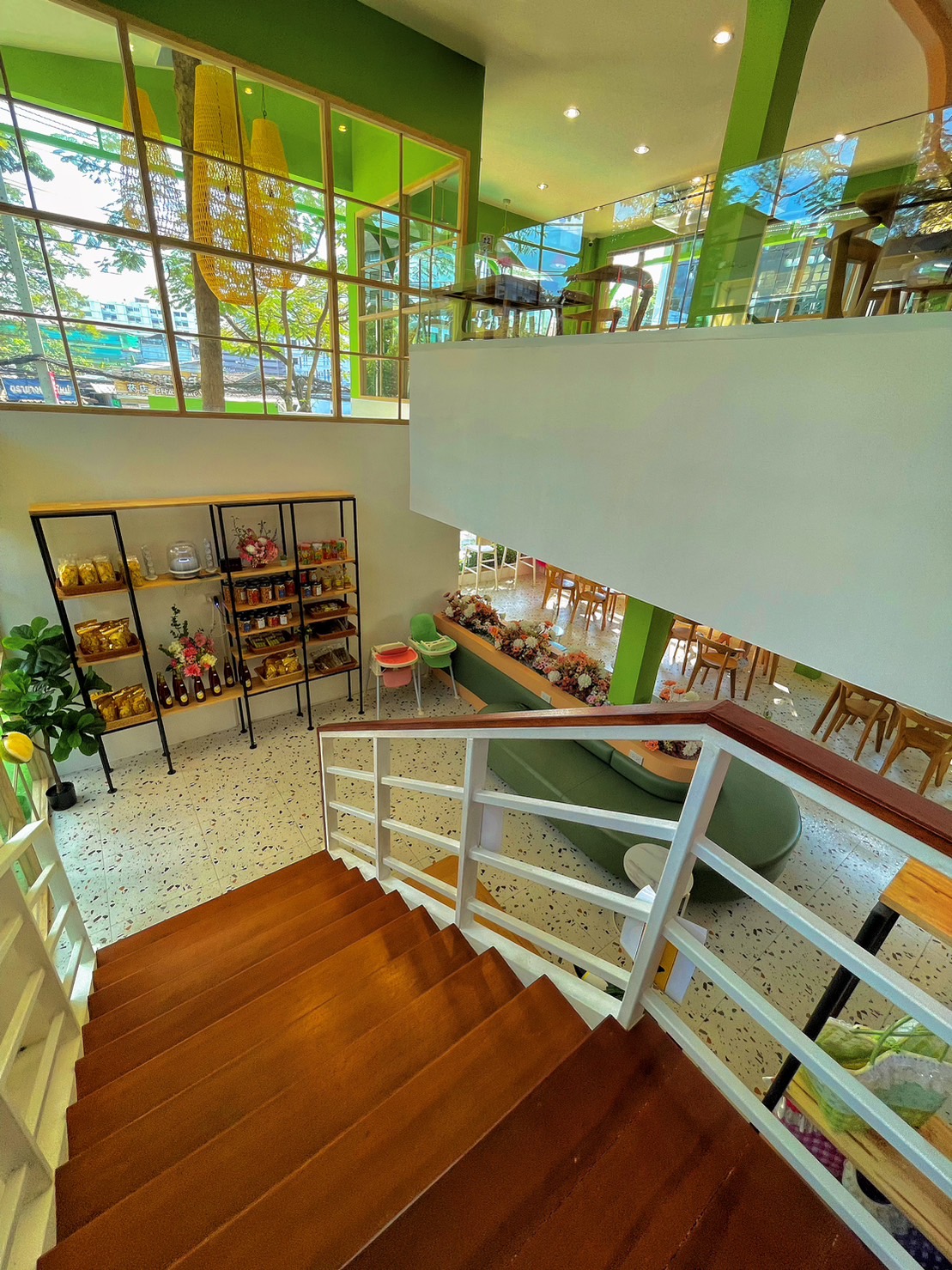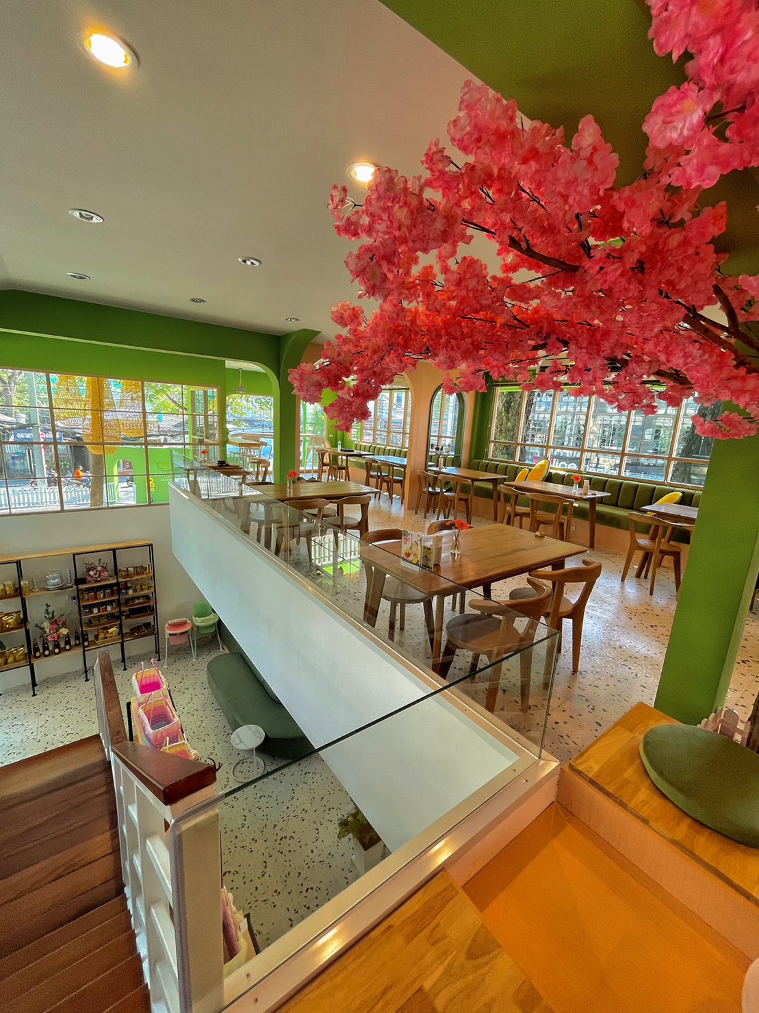 That being said, the atmosphere here can be concluded in one word — cheerful. From the significant bright green all over the place, to the animal sculptures and durian stuffies randomly seen in every corner; from the tall cherry blossom tree on the second floor, to wooden furniture that looks like a perfect match to the sunlight… It’s just like a picnic, but indoors.