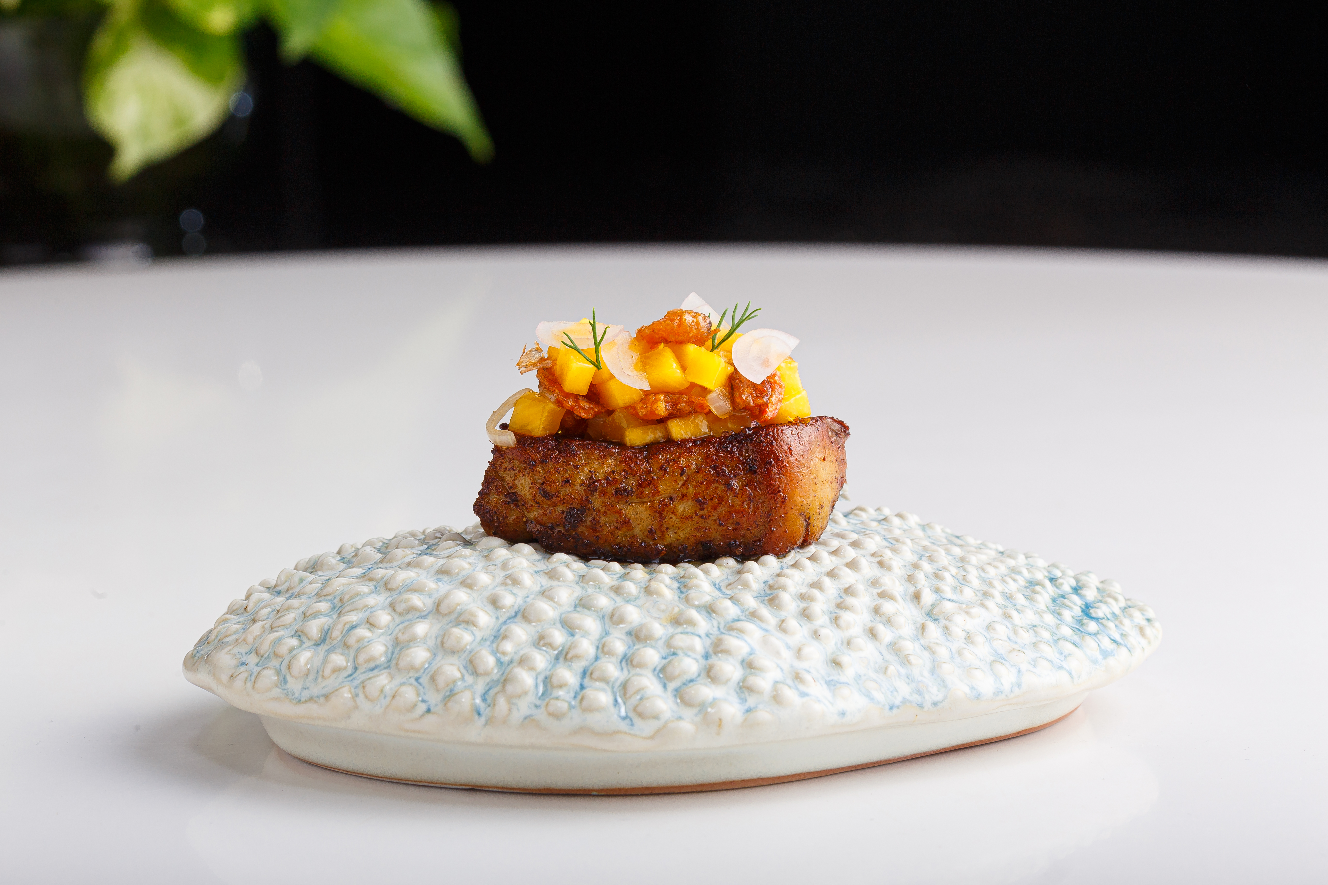 Dishes include sour sausages with egg, a starter inspired by a local dish found in most markets in Chiang Mai. However, it is nothing like what you will find in any market in Thailand, because this simple dish now has the grilled sour sausage served with truffle egg foam.