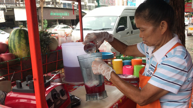 “I always buy local fruits sold by local farmers,” said Auntie Daeng. “And while the prices have gone up and down over the years, what I have always maintained is the 10 baht price I charge my customers. This is no different. My profit margins have now been reduced to 2-3 baht per cup. But I am selling 200-300 cups per day, even 400 when it’s really hot, and that is enough for me. It is about all of us surviving together.”