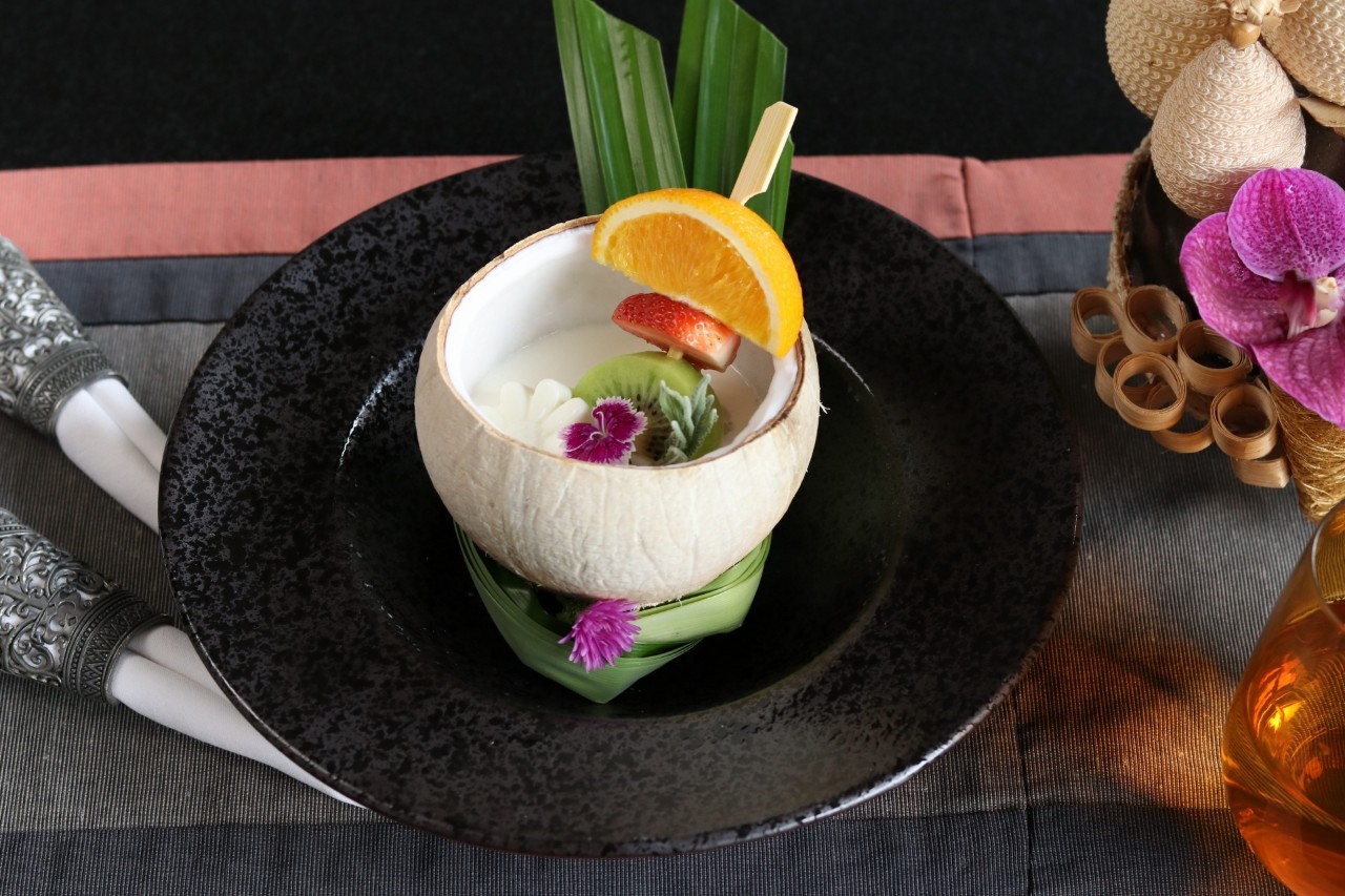 Even the desserts have a hint of whimsy to them such as the lamyai pudding which uses the local fruit to make into a jelly-ish pudding and served with fresh seasonal and imported fruits on a skewer.