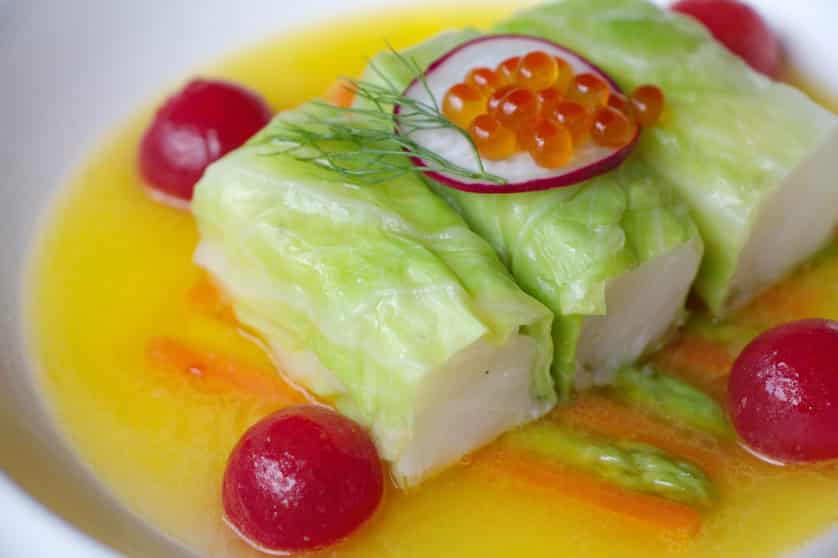 The steamed snow fish in ginger infused broth is a delicious dish where cabbage stock is used along with steamed cabbage leaves which are then used to wrap the snow fish before being steamed again. The stock is then mixed with just a little bit of butter and turned into a sauce which is served along with the fish, spring onions, coriander, lime and white wine.