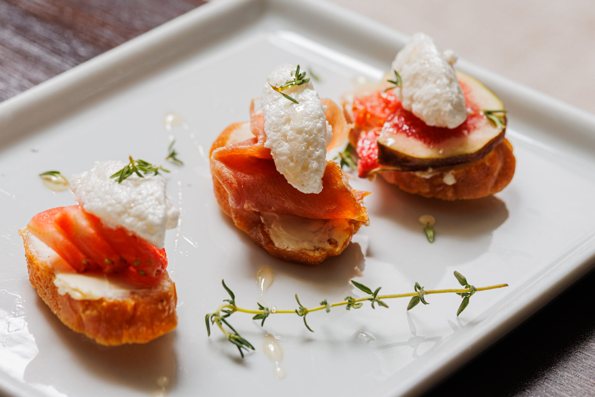 The evening begins gently with a gourmet trio of lightly grilled French baguette topped respectively with Parma ham, fresh fig, and strawberry, finished with cream cheese and a delicate drizzle of honey. Three bites, three moods — crisp, fragrant, and quietly indulgent.