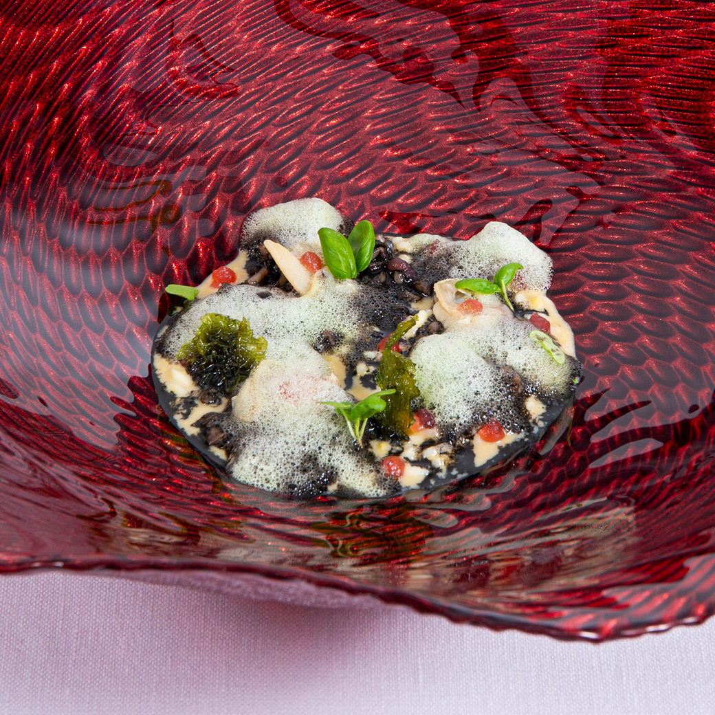Start off with charcoal-grilled and super fresh French Fines de Claire oysters on a creamy topinambur, or Jerusalem artichoke, puree served with a light nduja sauce, a spicy and spreadable pork sausage, an exciting start to the experience. This is then followed by an aromatic lemon-scented Hamachi tartare served in a sea urchin illusion – which sounds mystical – with buffalo mozzarella cream – which sounds intriguing.