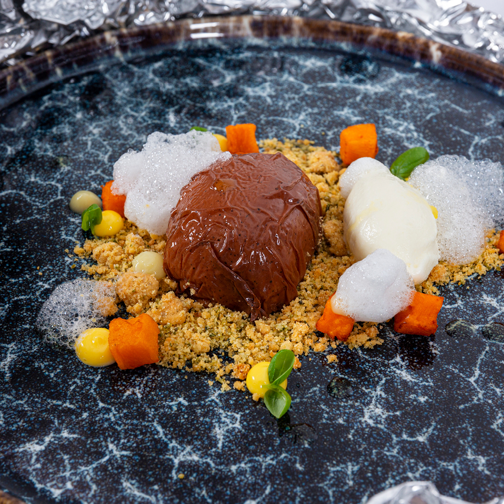 The meal ends with the chocolate stone shells, creamy milk chocolate stone shells, with mango purée and caramel mousse peanut cream crumble.