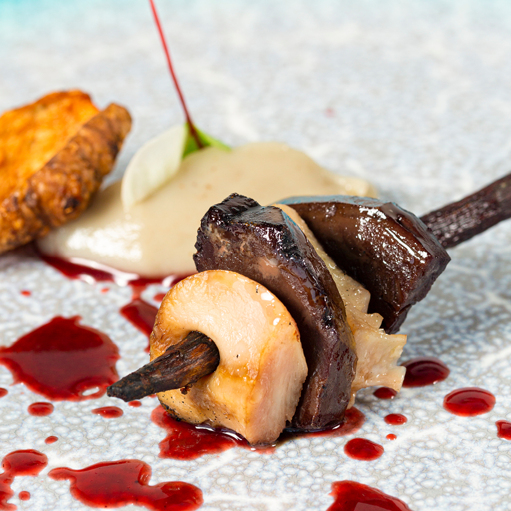 Ready for the main course? Chef Pasquale shows off his sea chops with this seabass and foie gras skewer, beautifully presented with an unusual Martini Dry-scented carrot cream and pineapple chutney