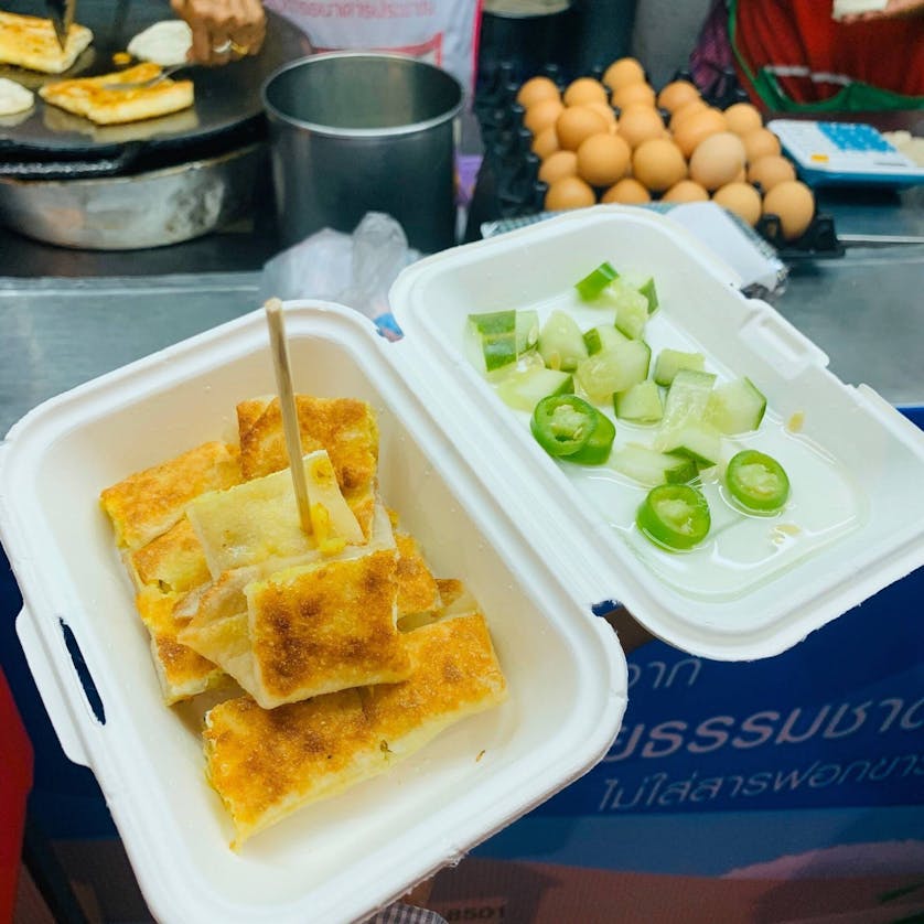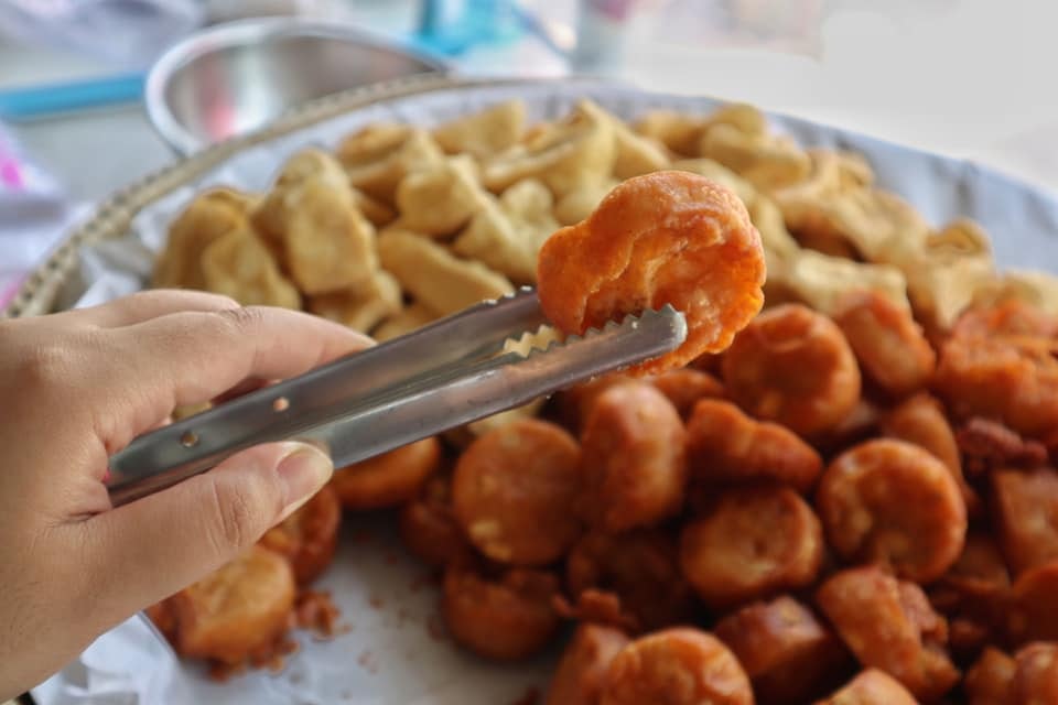 Tue Ka Ko or taro fritters, is a classic Thai snack with the perfect balance between sweet and savory and Tue Ka Ko Na Prince, opposite the Prince Royal College, is one of the best places to try. This long-standing shop has been serving Tue Ka Ko for over 20 years. Their fritters are made by wrapping taro in a thin dough, cutting them into bite sized before deep frying them in a hot pan. So, it offers a perfect texture and is served hot every day. Tue Ka Ko Na Prince also serves deep-fried tofu, which pairs perfectly with their signature sweet and sour peanut dipping sauce. Prices start at 20 baht per set, perfect for a quick and tasty snack on the go.