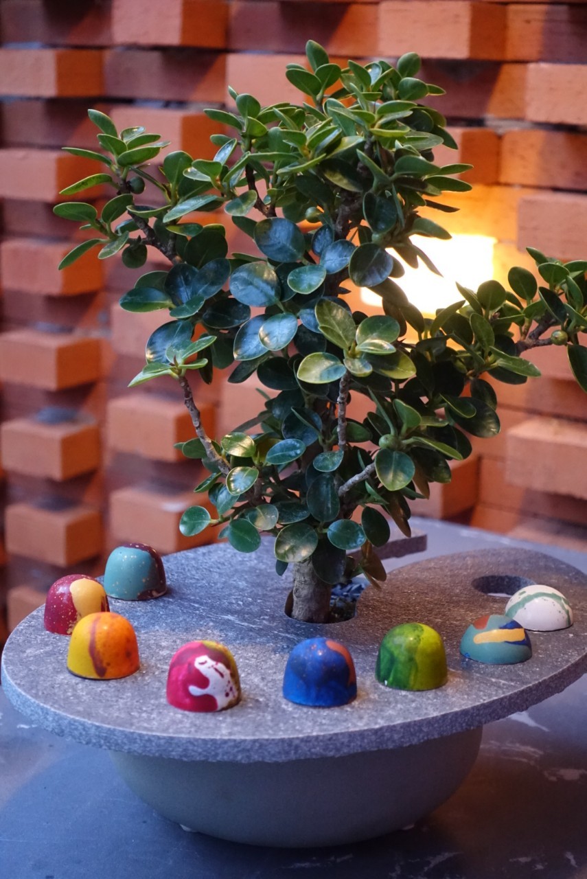 Jinda Manee is a perfectly sized chocolate bonbon, served in a set of 8 pieces. Each piece is meticulously hand-painted with beautiful abstract designs by the chef. They are filled with flavours that represent the local tastes of Thailand, following the seasonal ingredients. These include pandan, jasmine, honey tangerine, royal project coffee, and black sesame coconut. The fillings combine Thai flavours with a touch of Malibu rum, Kahlua, and Grand Marnier, enhancing the main flavours without overpowering them.