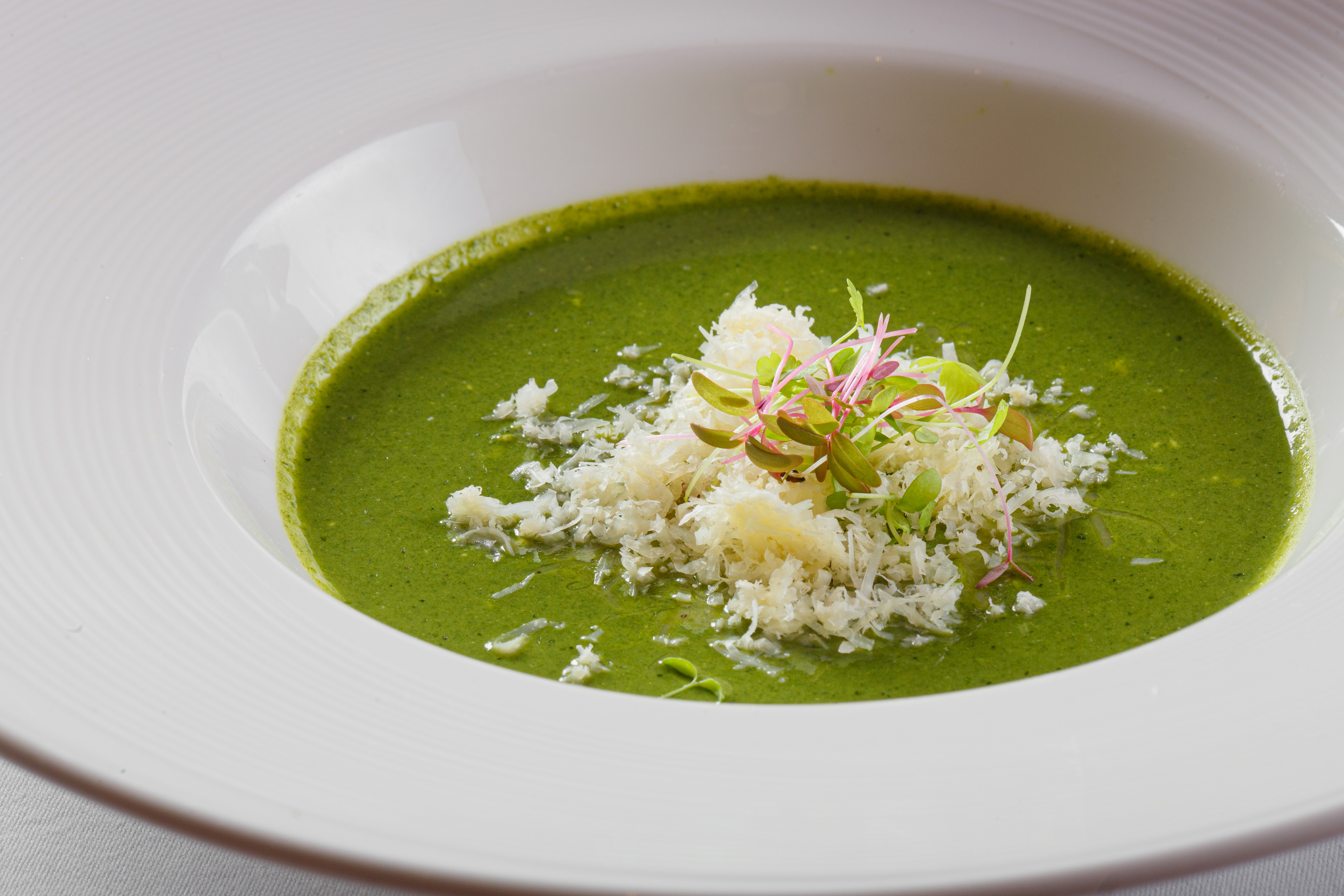 Next, the chef serves up a creamy spinach soup, a hearty but delicate soup, perfect for a rainy day