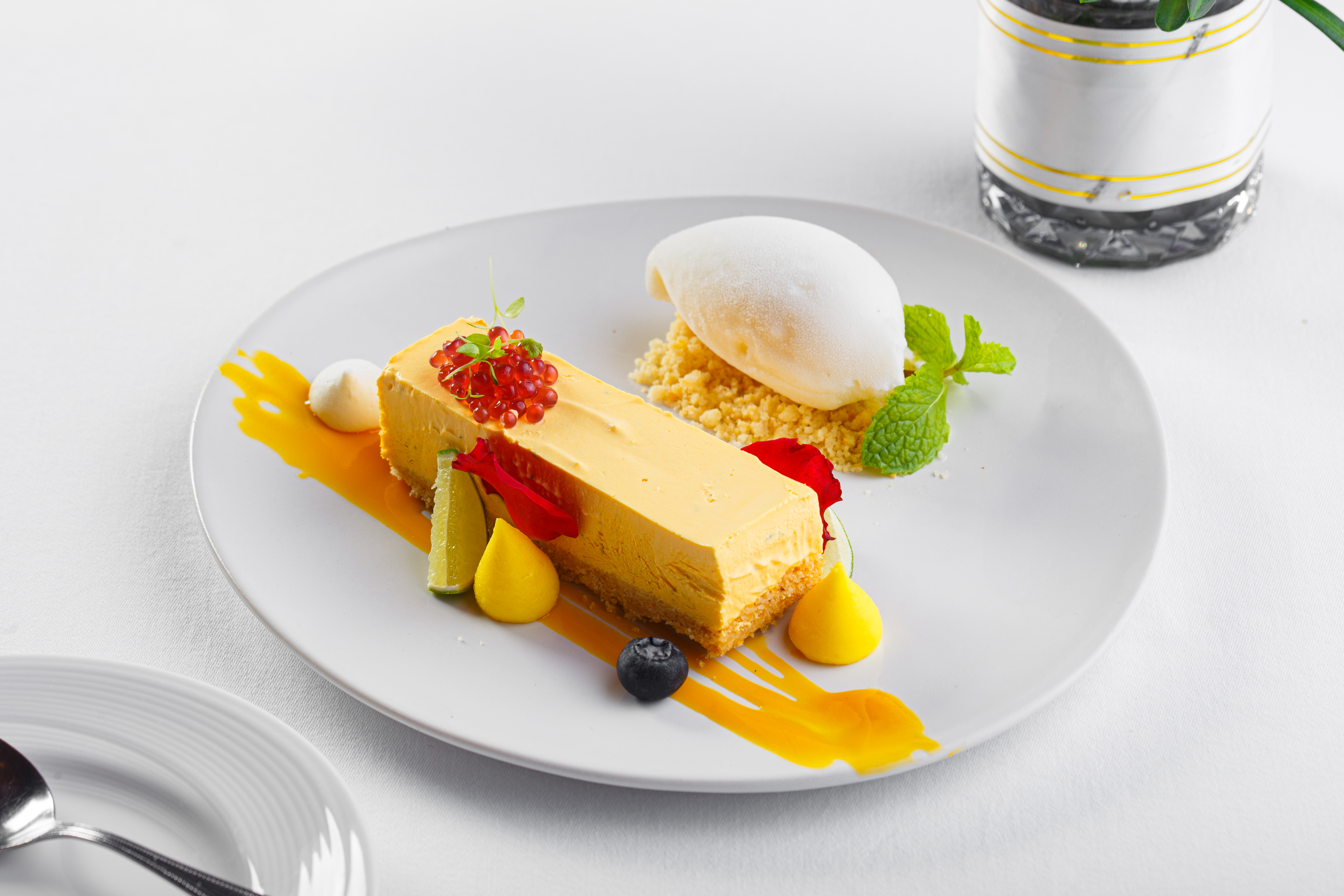 End the meal with a lovely key lime pie, a classic and slightly tart pie served with coconut ice cream, crumble and red wine caviar.