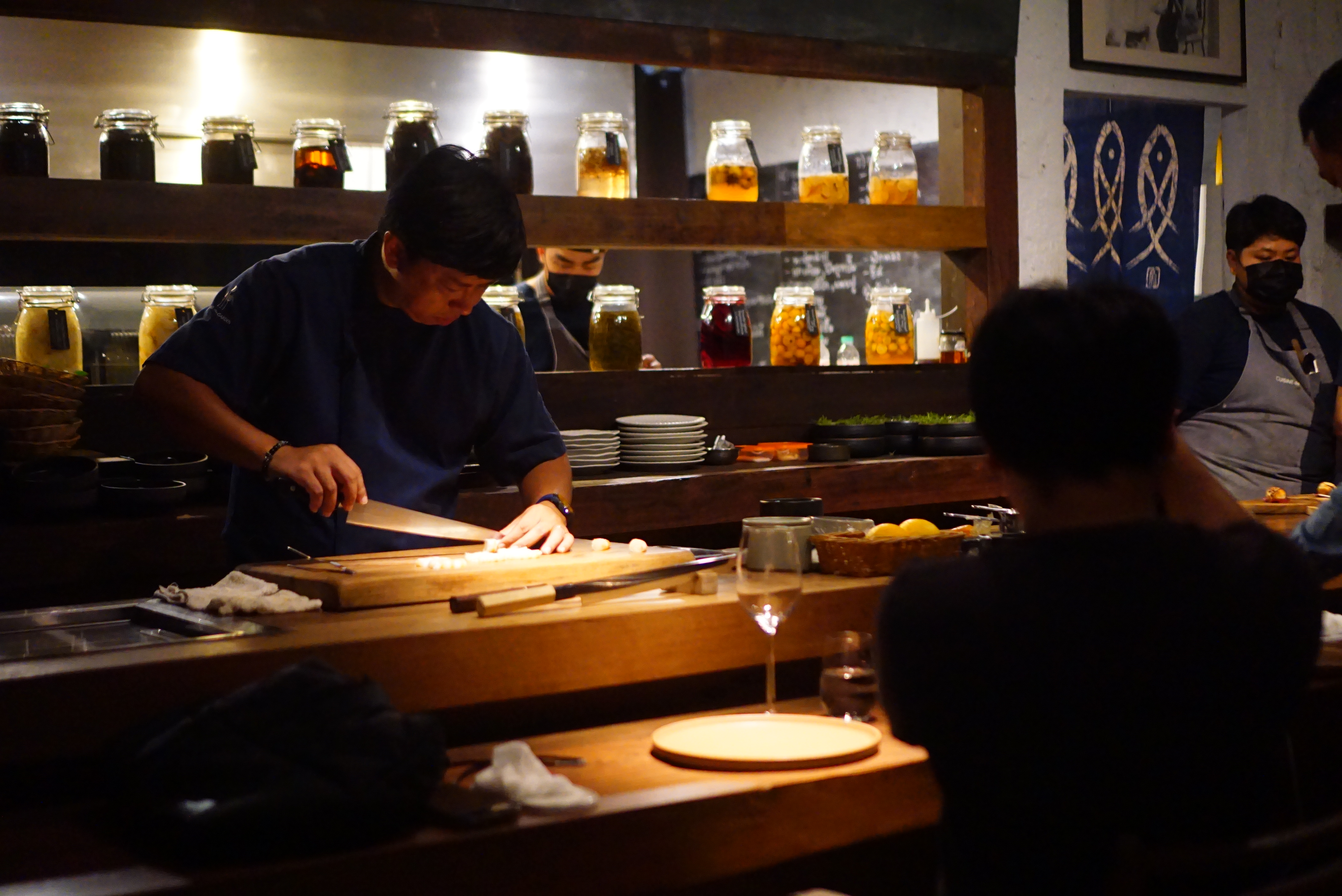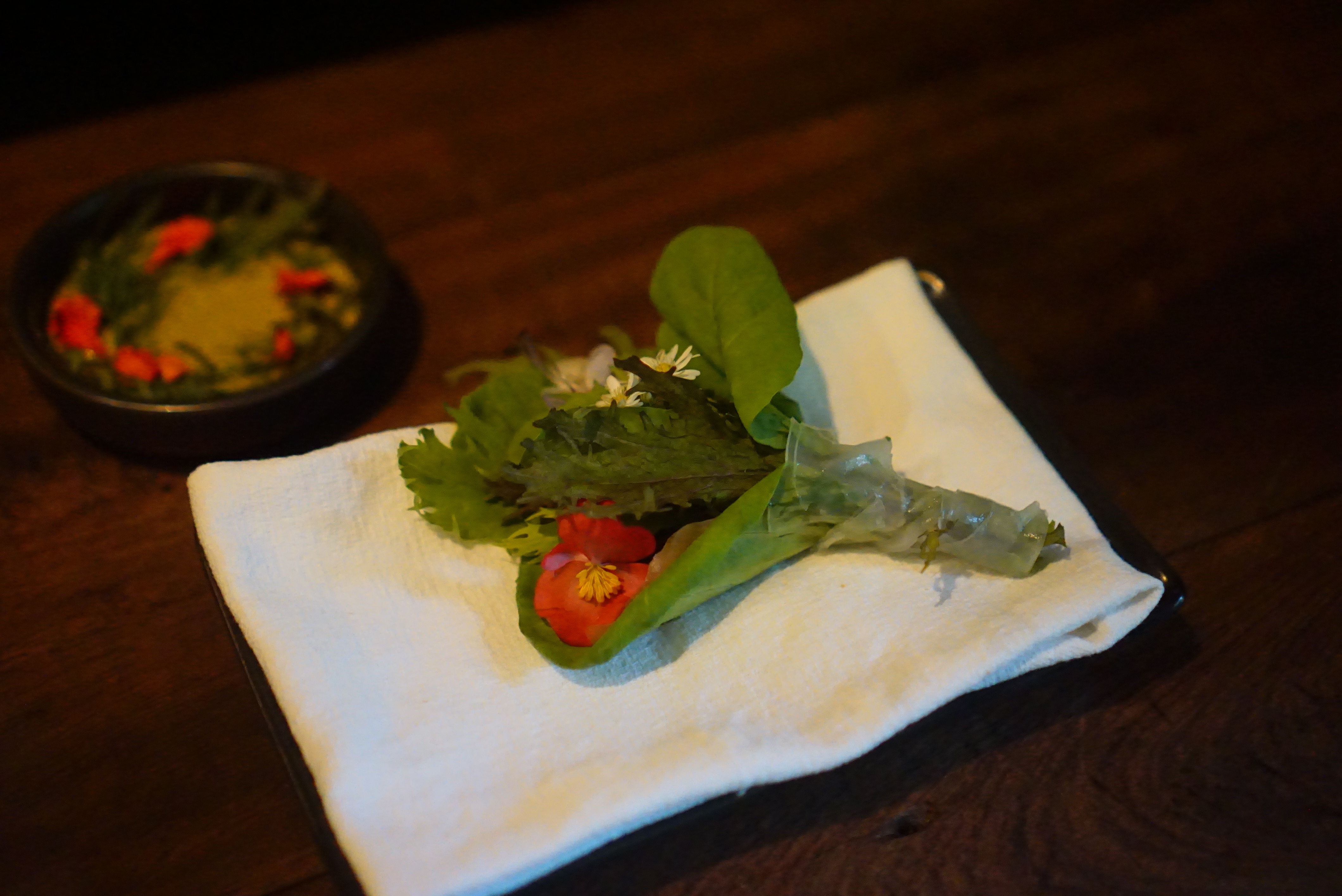 Bouquet: Seasonal vegetables served with wine-infused and low intervention raw fish with create of sabayon made from green chili paste.