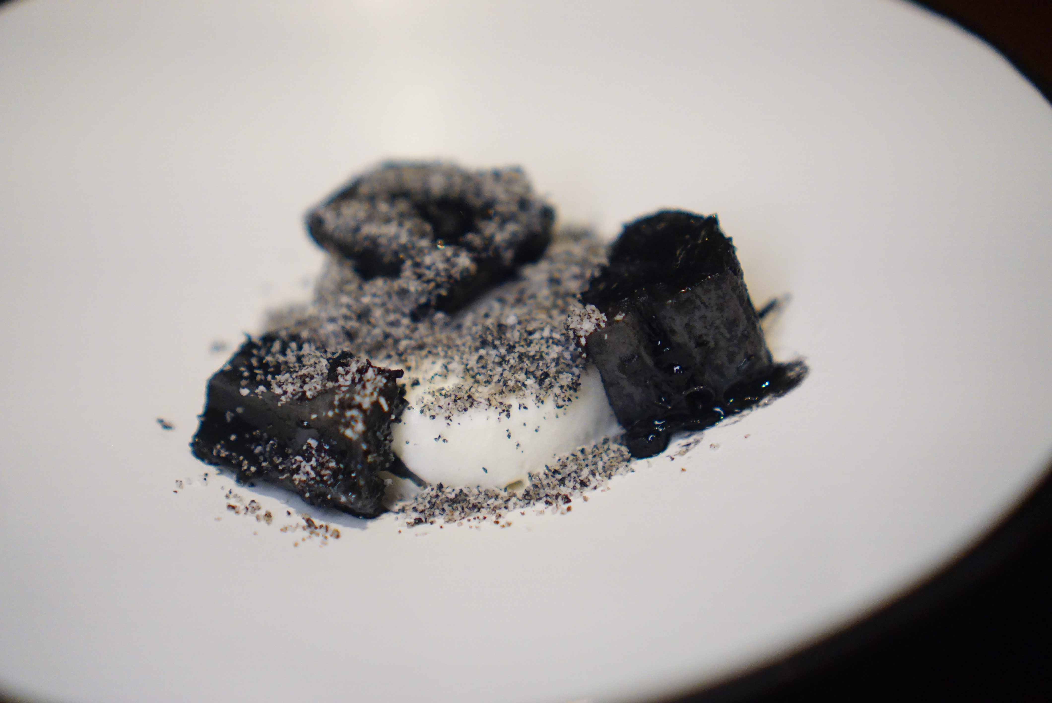 Cassava: Buttermilk ice cream served with charcoal and topped with coconut shavings.