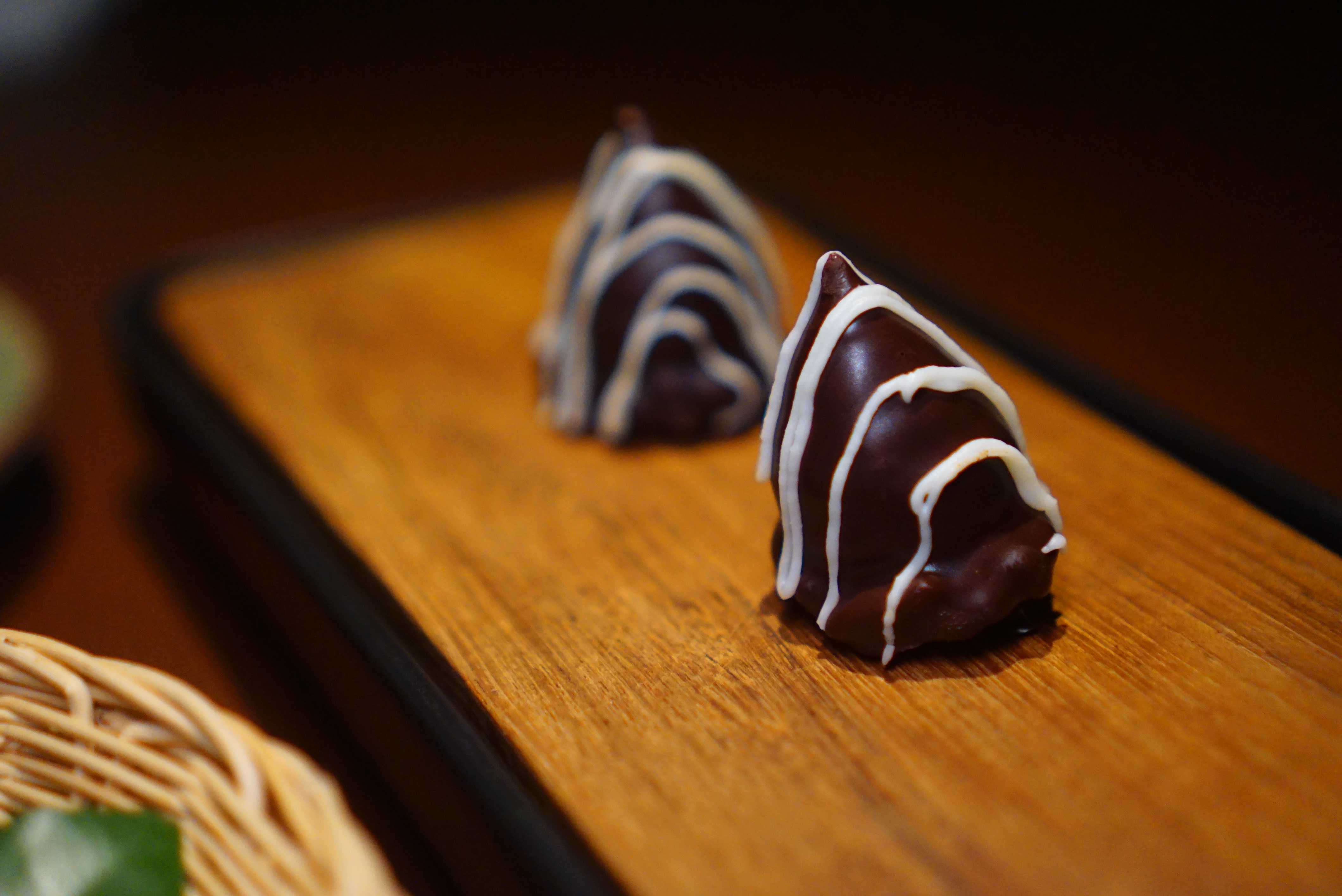 Petit Four: Two petit fours on a plate with decadent dark chocolates, truffles and all sports of other goodness.