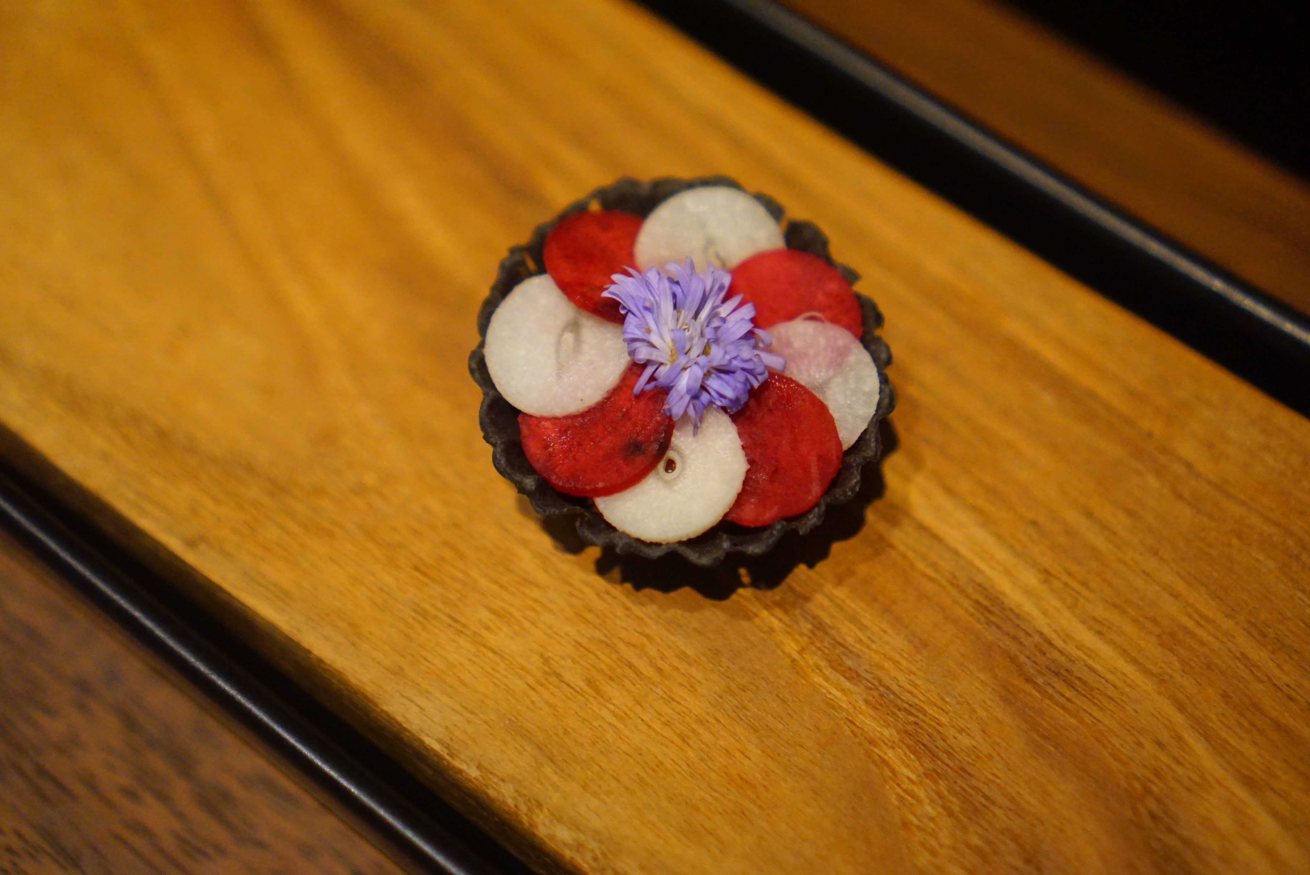 Beef Tart: Thinly sliced picked beetroots and garlic are served on a delightful mini tart made from crab juice with beef tartar.