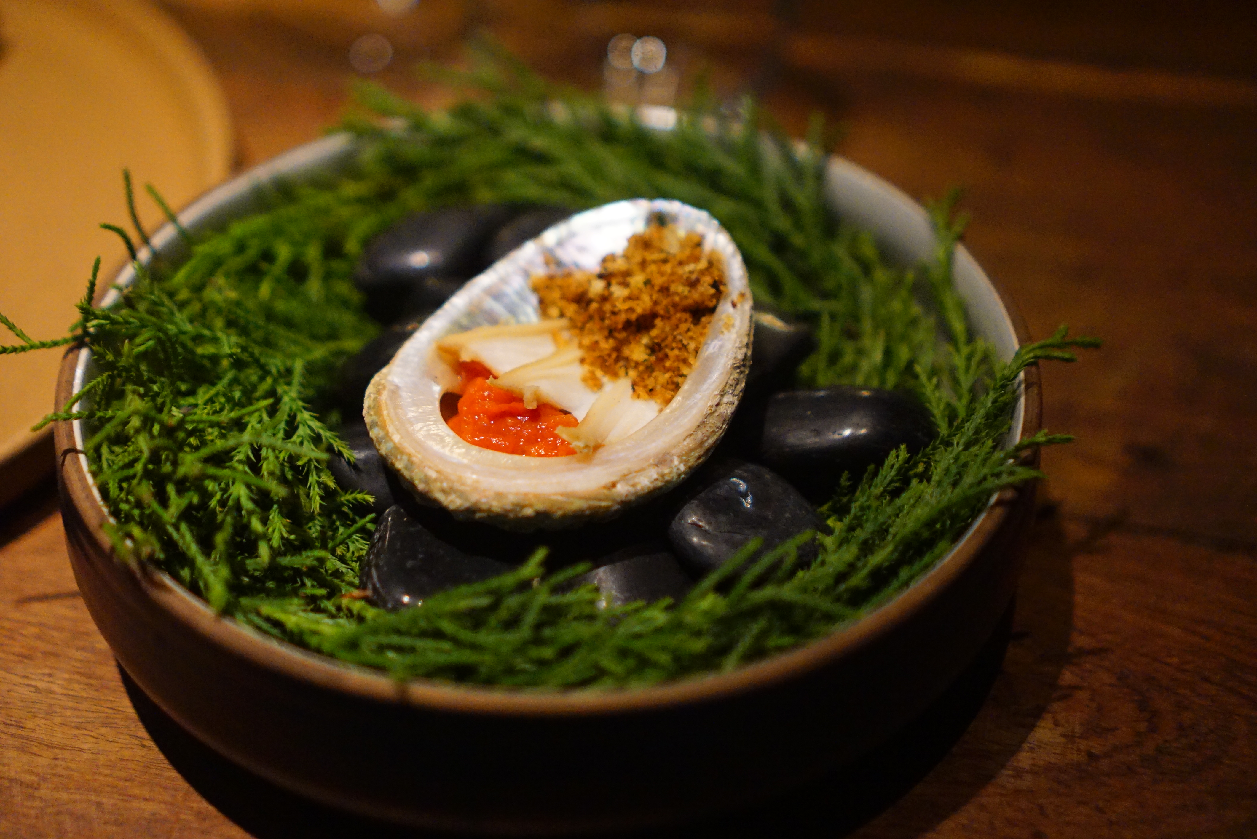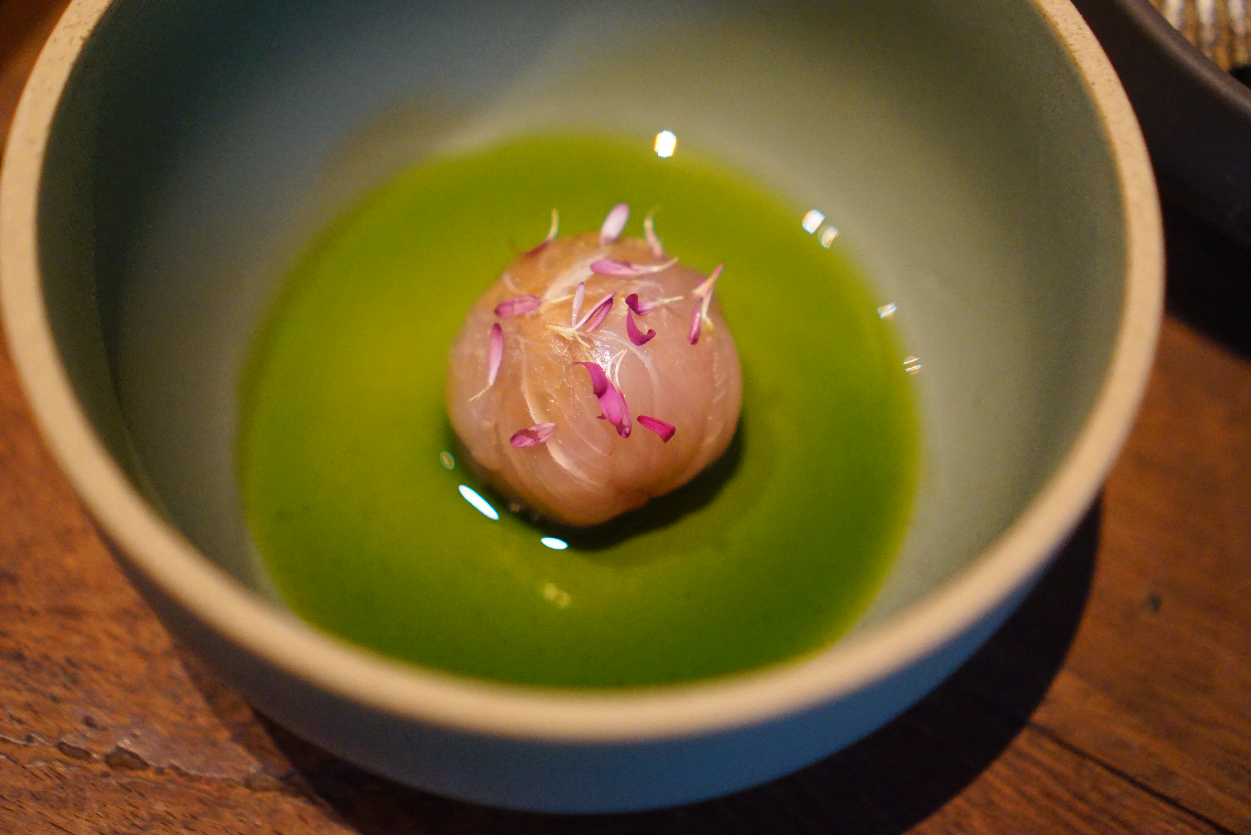 River Prawn: Delicate and sweet river pawns topped with sea salt are served with edible flowers and a soup made from the shells of grilled prawn.