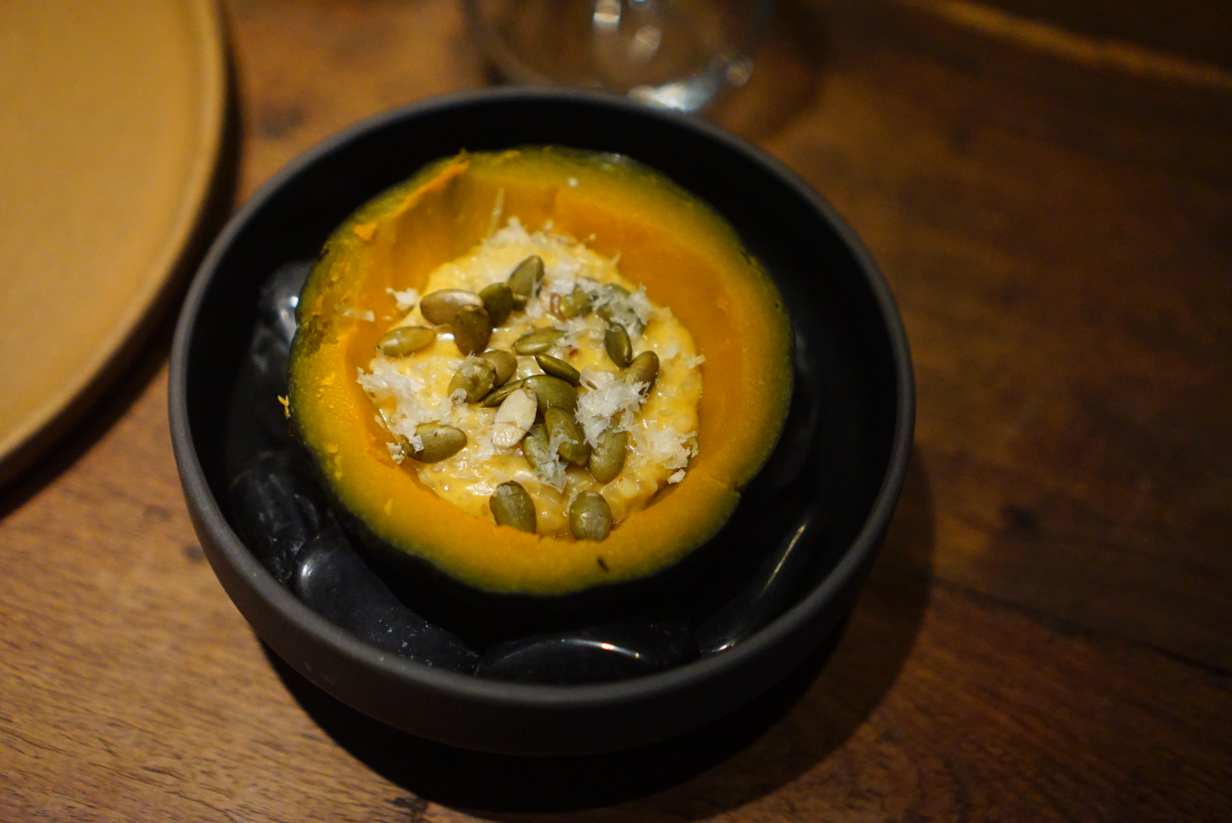 Risotto: Hill tribe risotto with butternut pumpkin topped with pumpkin seeds and cheese, served in a mini pumpkin.