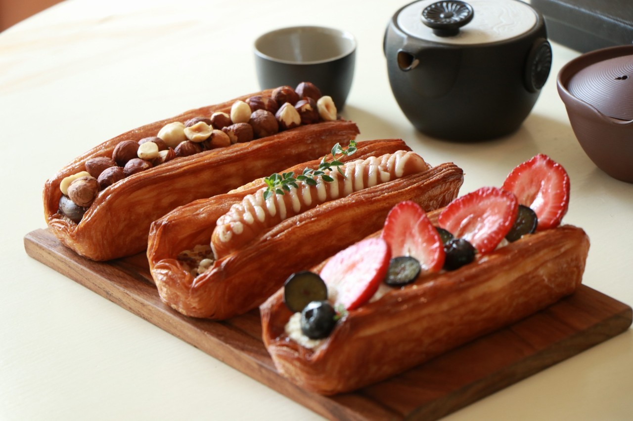 But if you aren’t into flans, you still can dig into all sorts of sweet delights from the classic Danish, the caramel pudding, mango or strawberry Danish, the chocolate matcha lava or the sinfully decadent log croissants which are filled with Ferrero Rocher chocolate hazelnut, mixed berry cream cheese and even a German sausage!
