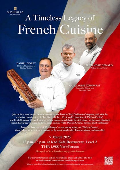 On the 9th of March of this year, Chef Daniel Gobet, 2018 winner of the World Pâté en Croûte Championship, will be joining Shangri-La Chiang Mai’s Executive Chef Guillaume Comparat as well as Executive Chef Alexandre Demard, pâté en croûte master, to present Chiang Mai diners with the absolute best of French charcuterie.