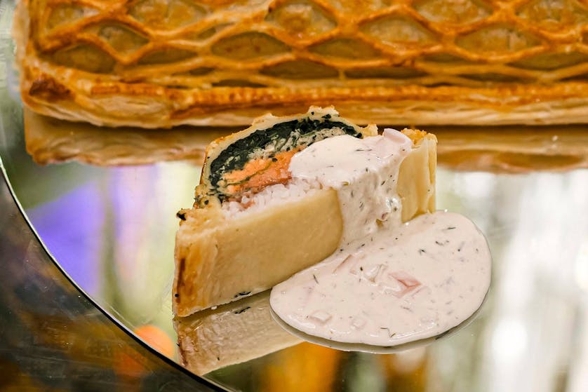 This particular charcuterie was first served as a starter in France in the 13th century, its thick hard crust in those early days not meant to be eaten, but to act as a preservative for the meat. Various cuts of meat were used for the fillings from pheasant to boar, pork to chicken, duck to venison, and soon, within a few centuries, pâtés en croûte were found across France; cooks and street vendors tinkering with the recipe and using the best as well as the cheapest cuts of meat, depending on budgets, availability and creativity. It wasn’t until the 17th Century that pâtés en croûte were elevated with the addition of the flakey layers of feuilletages—puff pastry—enhancing the treat with their elegant and delicate layers. However, it is believed that over industrialisation for the past century, with mass production dropping not just the overall quality but also the presentation of the dish, this near-millennia staple pâté en croûte slowly began to disappear from French tables and menus.