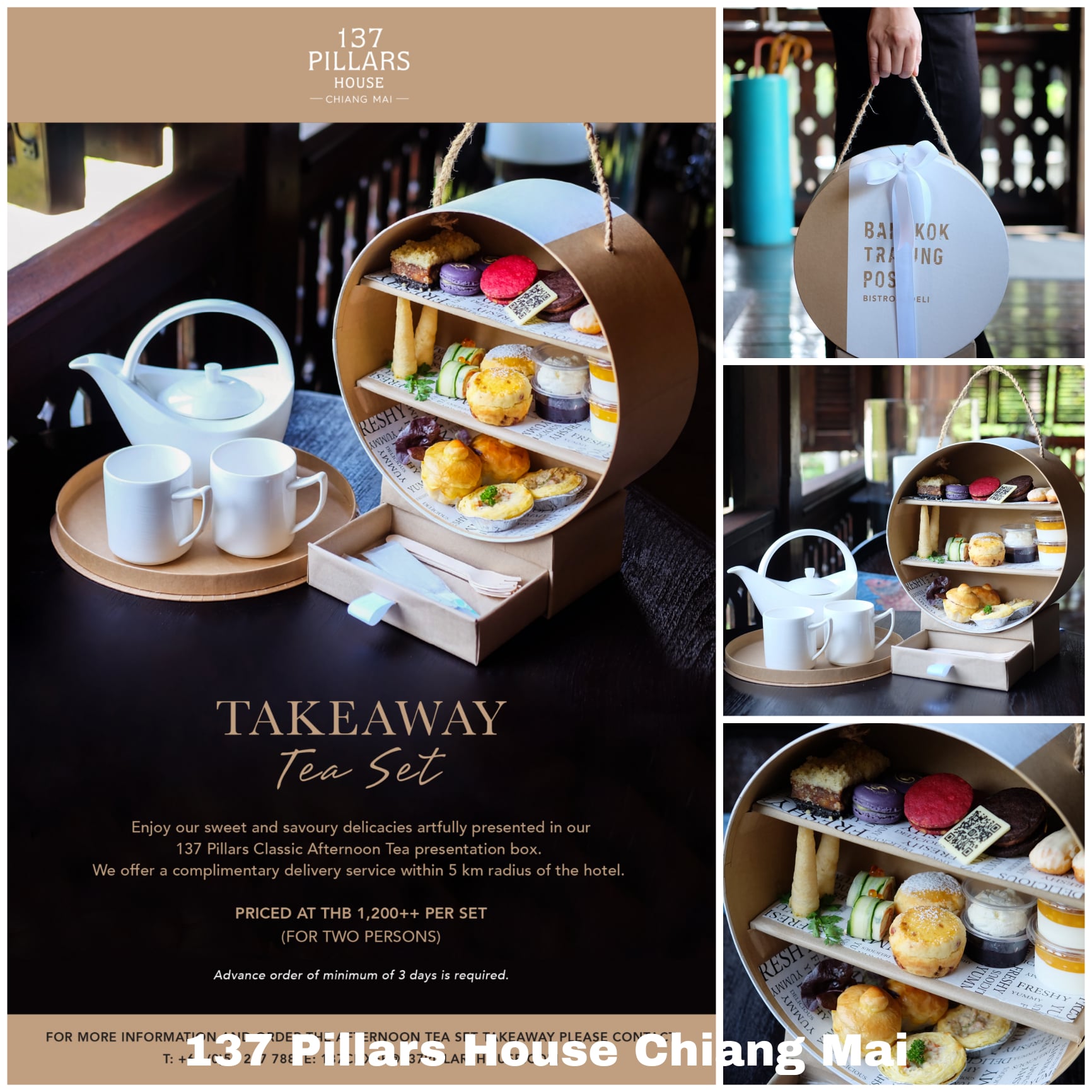 Sweet teeth will come with a huge smile with this special 137 Pillars Classic Afternoon Tea takeaway set. While the price isn’t quite as street-level as others’, costing 1,200 baht per set for two, this is no normal soi-side tea set. Arriving in an elegant reusable container complete with napkins and cutlery, this tea set which includes all manner of exotic teas to choose from as well as both sweet and savoury bites, will be delivered to your door with three days’ notice within a five km radius of the hotel.