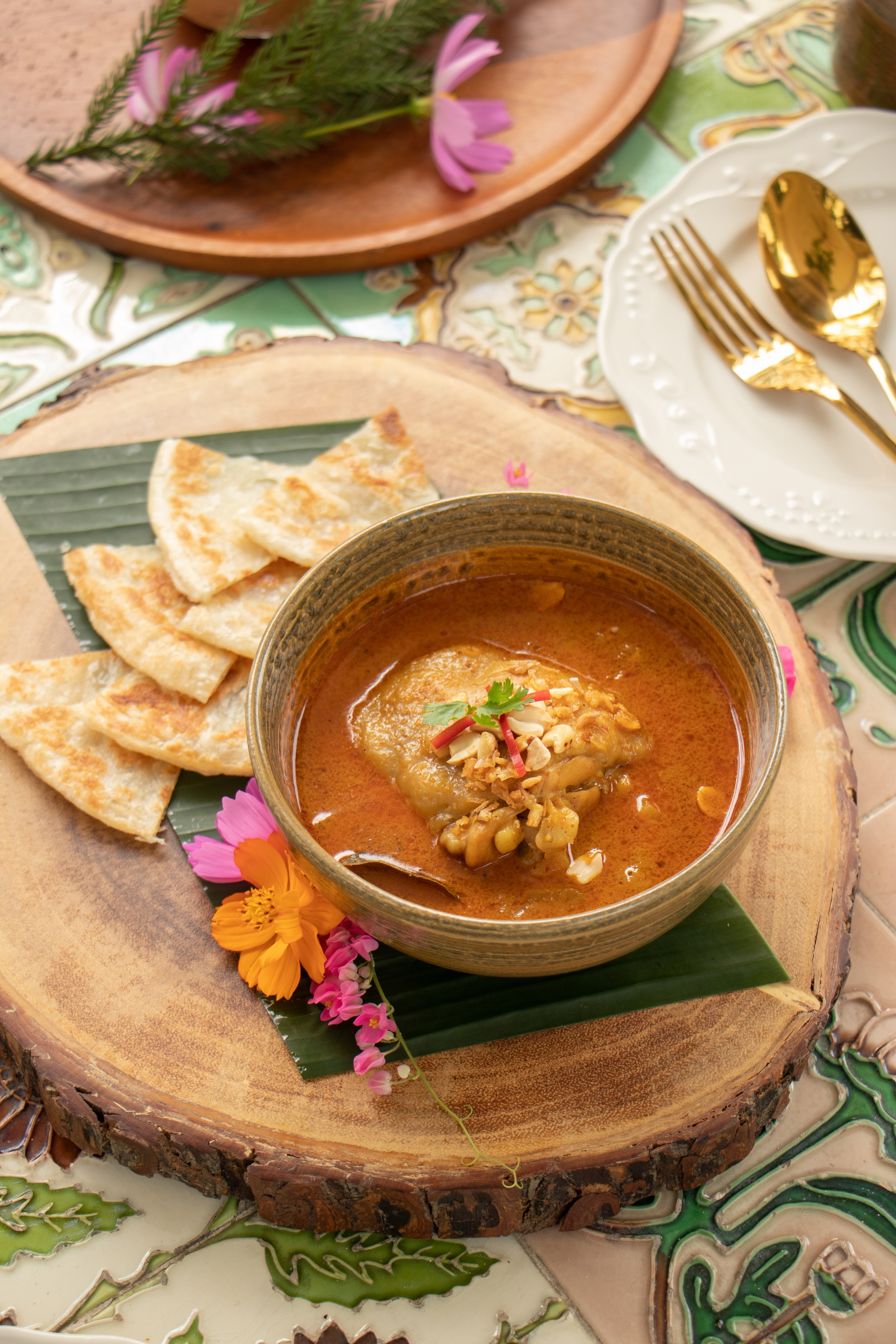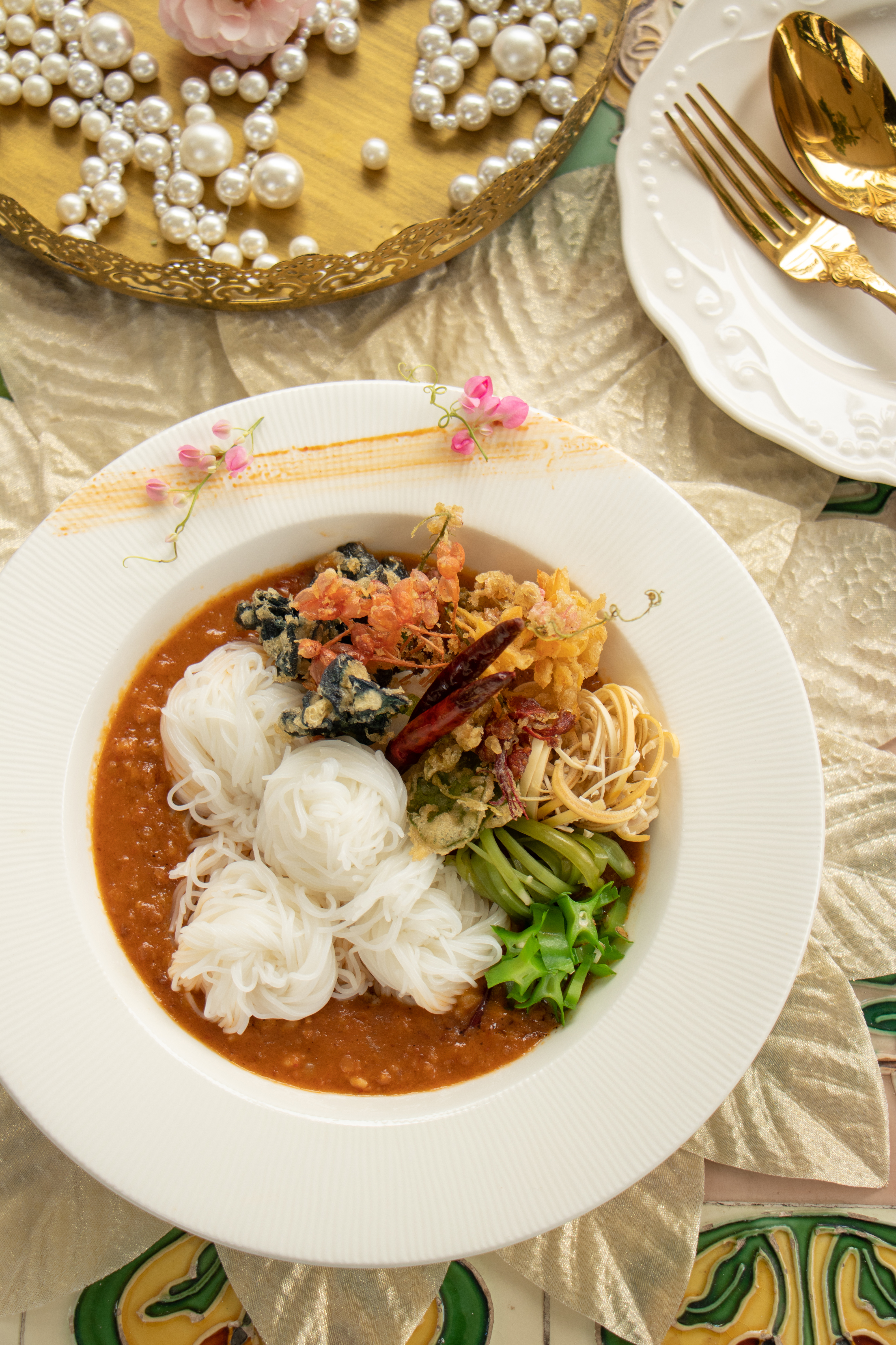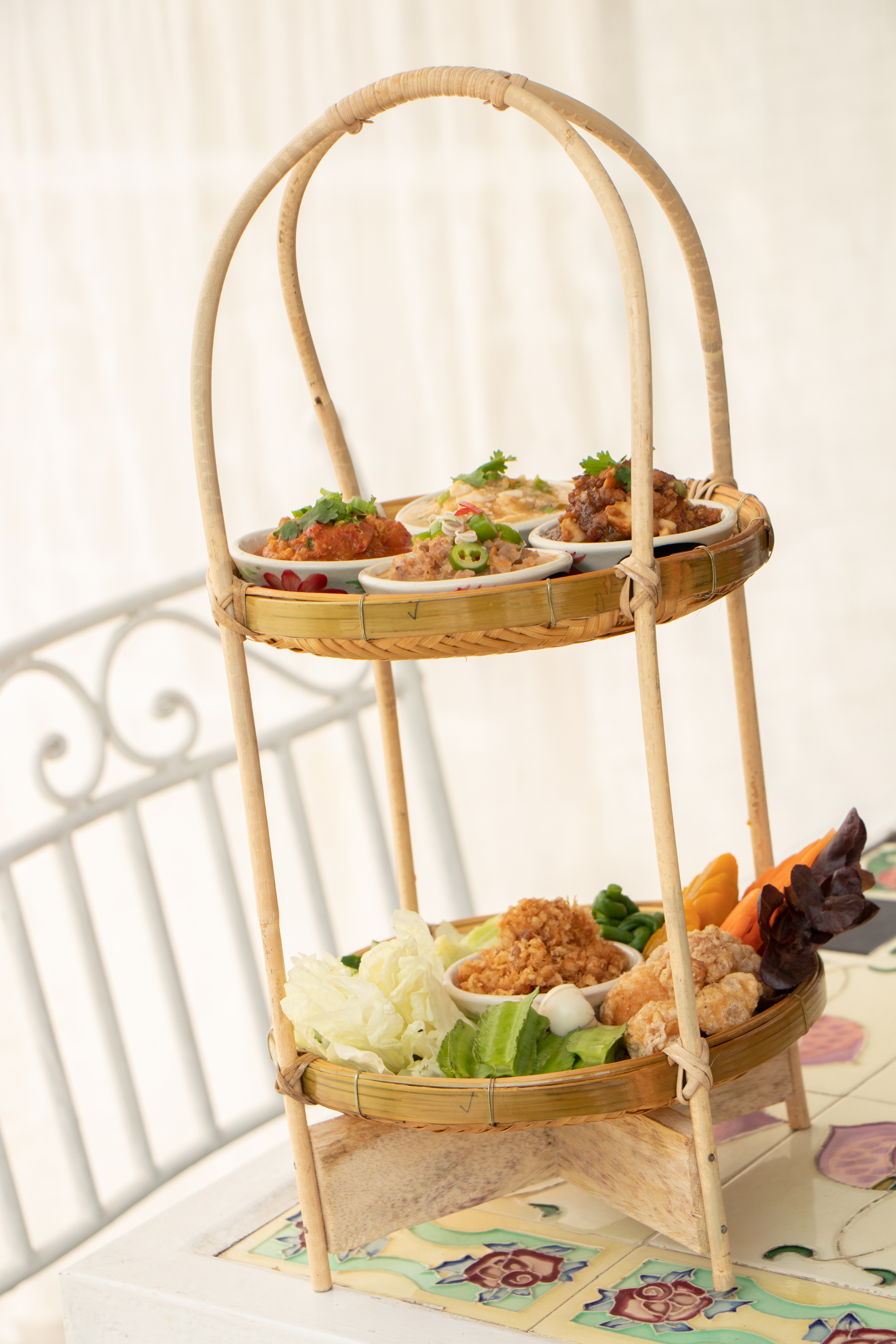 Start off with the flower salad inspired by a popular noodle dish where minced pork and edible flowers are rolled up into bite-sized rolls and served with a duo of traditional spicy and gentler mayonnaise cream sauce. Another must try dish is the fall-off-the-bones barbeque ribs coated in rich and delicious sauce and served with a kaleidoscopic array of edible flowers. The classic kanom jeen nam prik noodles is a rare treat at the best of times, but when served with pork and tempura flowers, it is elevated to an art form. Our last recommendation is the chef’s greatest pride, a smorgasbord of chili dips which arrives on a tiered tray, offering four tasty dips served with Northern meats, pork rind, vegetables…and you guessed it, edible flowers!