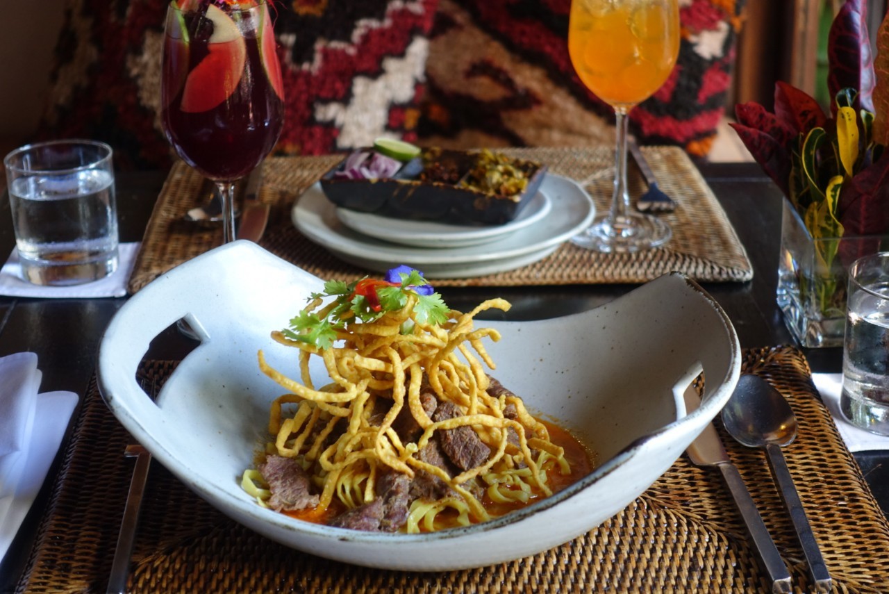 Egg noodles in a rich curry broth with beef (Khao Soi Nuea). The aromatic curry broth and quality beef stew are a perfect combination of sweet, creamy, and mild spices. The Khao Soi is served with slices of lime, thinly sliced shallots, and tangy pickled cabbage.