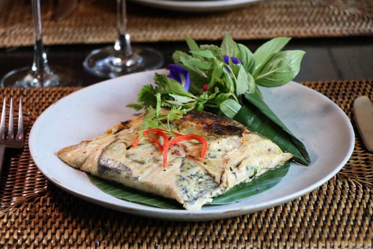 Grilled sea bass fillet with curry in banana leaves is also recommended. This is a traditional Lanna dish made with sea bass and mixed with a unique aromatic herbal curry paste, wrapped in banana leaves, and grilled over low heat. A simply delicious feast!