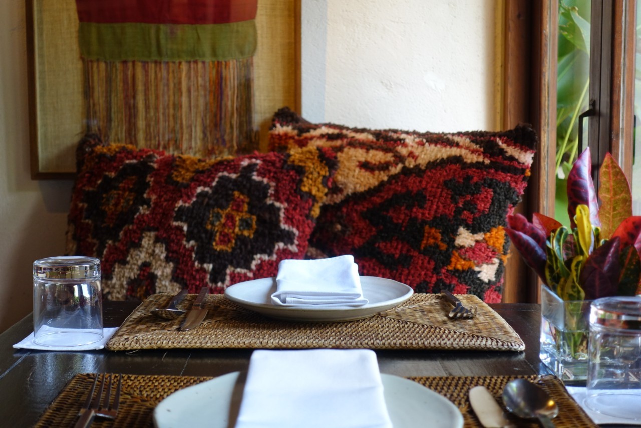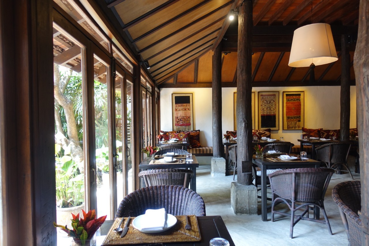 Set in the charming Tamarind Village Hotel, RuenTamarind Restaurant has long been a preferred destination for those looking for authentic Thai flavours. This cozy café-styles restaurant has recently been transformed to showcase Lanna and other regional cultures through classic decorative items such as sbai or phaa biang, a shawl-like garment worn by women in Laos, featured in a collection dating over 50 years old. These curative textiles are featured in a frame and displayed on the walls showing the distinctive art of Laotian weaving. Afghan cushions adorn with wooden chairs brighten up the atmosphere of the restaurant. Cushion covers match harmoniously with the furniture and overall interior design.