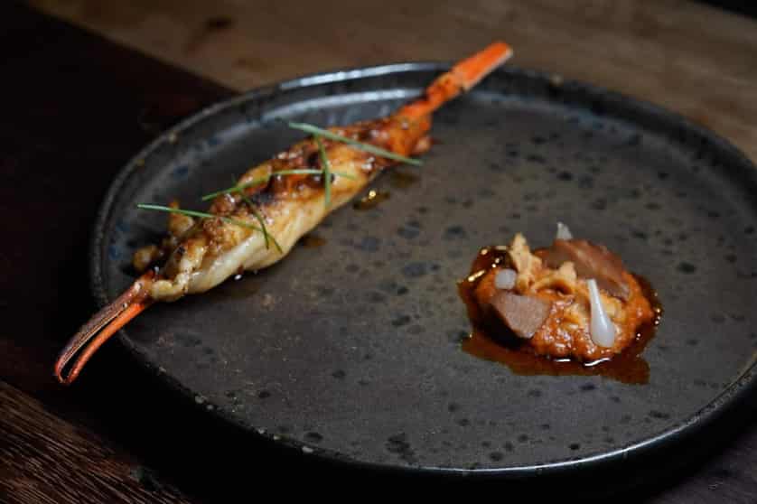 The river prawns are slathered with river prawn oil then gently grilled. Pickled mushrooms and powdered mushrooms are added for texture and flavour.