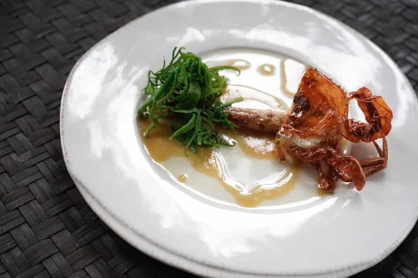 The squid is sliced paper thin and shocked briefly in hot water, while the more stubborn tentacles are poached to perfection. Simply sprinkled with salt with a splash of kaffir lime infused coconut sauce and served with picked mushrooms.