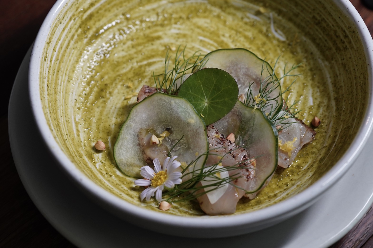 The fish, arriving weekly, will be prepared differently each time, depending on what Chef Nan deems most suitable. Sometimes it will be raw, others picked. We tried the slightly charred snow fish coated in tarragon oil and served with kale sabayon, fresh cucumbers and pickled garlic. The overall effect was reminiscent of the classic escargot.